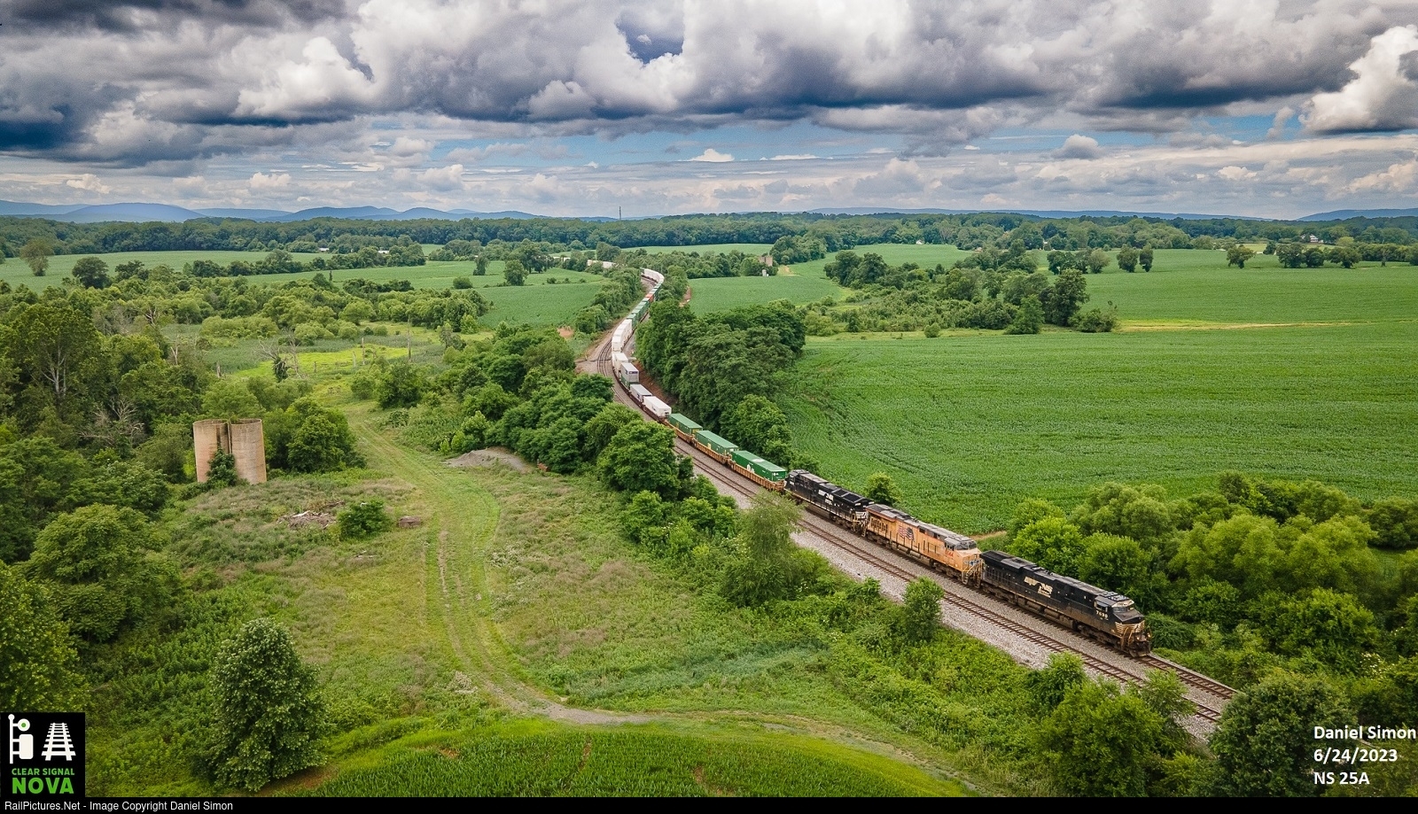 | Norfolk Southern Train 25A comes meandering through the sea of crops just outside of The Plains, Virginia heading east on the NS B-Line. |