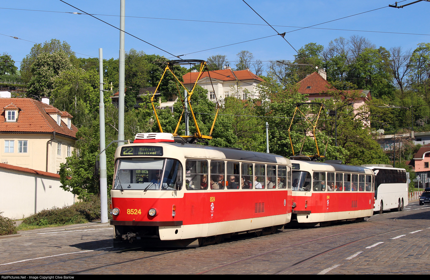 | Dopravní podnik hlavního mesta Prahy a.s. CKD Tatra T3R.P 8524 & 8546 approach the stop at Malostranska whilst working route 22 on 10th May 2023.