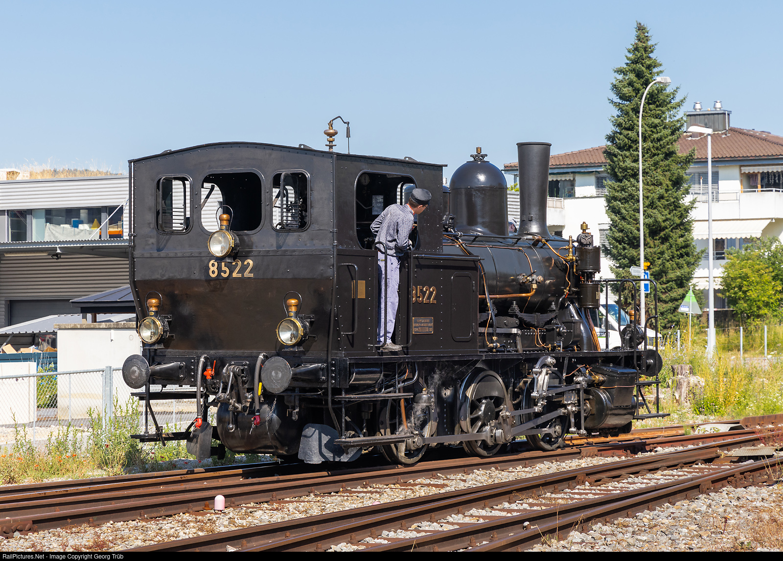 0-6-0 T steam shuntinglocomotive E 3/3 "Tigerli" # 8522 of the Sursee-Triengen Bahn (ST), in Triengen. Built in 1913 by the SLM for the SBB. The locomotive was equipped with an electric steam generation system on a trial basis at the SBB workshop in Yverdon on February 11, 1943, due to lack of coal during WW II. This consisted of two electric evaporators, which were fed with current from the contact wire via two transformers. The system was removed again on April 24, 1953 and the locomotive was rebuilt as a normal steam locomotive with coal firing. From 1972 to 1987, the locomotive was in service under the direction of the Verein Dampfbahn Bern. This association took over the locomotive in 1972 and restored it to working order. The locomotive worked off the overhaul costs with the use lasting until 1987 with this association. Since 1987 the locomotive is again in Sursee. From May 2006 to 2008, it was thoroughly refurbished. It received a refurbished exchange boiler, which was previously in use on the E 3/3 # 8483. Over the winter of 2019 / 2020, overhaul work was carried out on the locomotive in Jenbach, Austria, at the Zillertalbahn workshop. In the fall of 2020, the work to bring the locomotive back into service was completed in Sursee and the locomotive was used again for the first time in a long time on the Sursee - Triengen line on September 27, 2020.