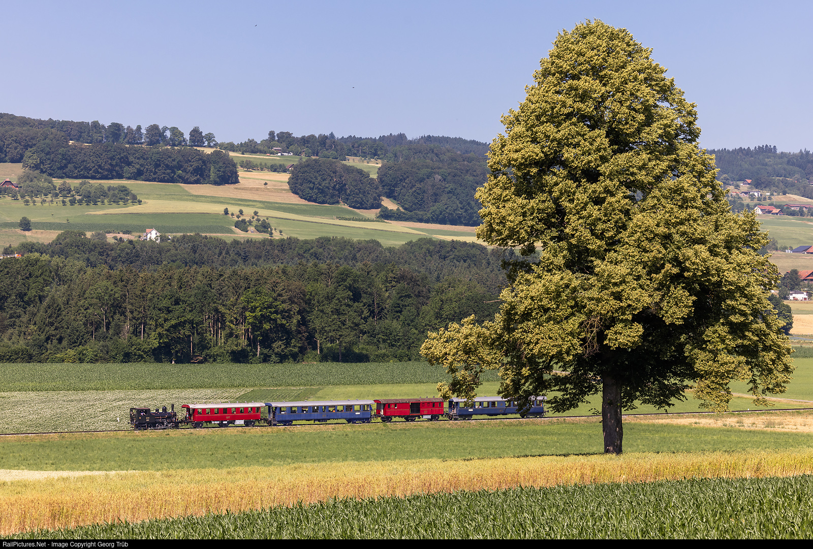 0-6-0 T steam shuntinglocomotive E 3/3 "Tigerli" # 8522 of the Sursee-Triengen Bahn (ST) pulls the 10.30 AM train from Triengen to Sursee, near Büron-Bad Knutwil. The 8,9 kilometer long line of the Sursee-Triengen Bahn was never electrified, passenger service was discontinued in 1971. The # 8522 was built in 1913 by the SLM for the SBB. The locomotive was equipped with an electric steam generation system on a trial basis at the SBB workshop in Yverdon on February 11, 1943, due to lack of coal during WW II. This consisted of two electric evaporators, which were fed with current from the contact wire via two transformers. The system was removed again on April 24, 1953 and the locomotive was rebuilt as a normal steam locomotive with coal firing. From 1972 to 1987, the locomotive was in service under the direction of the Verein Dampfbahn Bern. This association took over the locomotive in 1972 and restored it to working order. The locomotive worked off the overhaul costs with the use lasting until 1987 with this association. Since 1987 the locomotive is again in Sursee. From May 2006 to 2008, it was thoroughly refurbished. It received a refurbished exchange boiler, which was previously in use on the E 3/3 # 8483. Over the winter of 2019 / 2020, overhaul work was carried out on the locomotive in Jenbach, Austria, at the Zillertalbahn workshop. In the fall of 2020, the work to bring the locomotive back into service was completed in Sursee and the locomotive was used again for the first time in a long time on the Sursee - Triengen line on September 27, 2020.