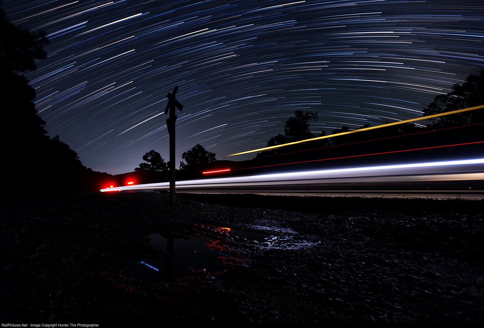 All Just A Blur | Just a couple of hours after midnight on the morning of Sunday, June 25, 2023, southbound CPKC manifest train M262 cruises down the Rich Mountain grade at Eagleton, AR. Lights from the mid-train DPU and the EOT illuminate the tracks while the earth rotates for an hour beneath a clear sky.