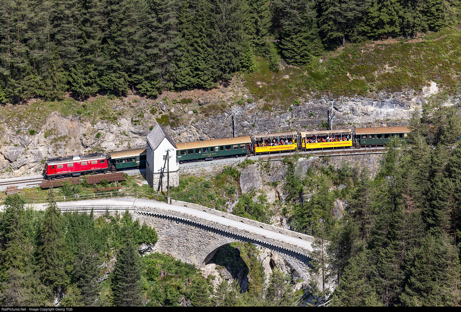 The oldest locomotive of the Rhaetian Railway in regular service (not historic vehicle), Ge 4/4 I # 603 "Badus", built in 1947, pulls the nostalgia train "Zügen Schlucht" R 7815 entering Davos Wiesen station. The nostalgia train Zügen gorge run two time a day in summertime between Davos Platz and Filisur and vice versa, replacing a timetabled "Capricorn" train with a little longer journey time. Last summer, every other week a "Rhaetian Crocodile" Ge 6/6 I pulled the train, but in the moment both of them, # 414 and # 415 are out of service due to cracks in the wheels. In the foreground is the road bridge to Jenisberg.