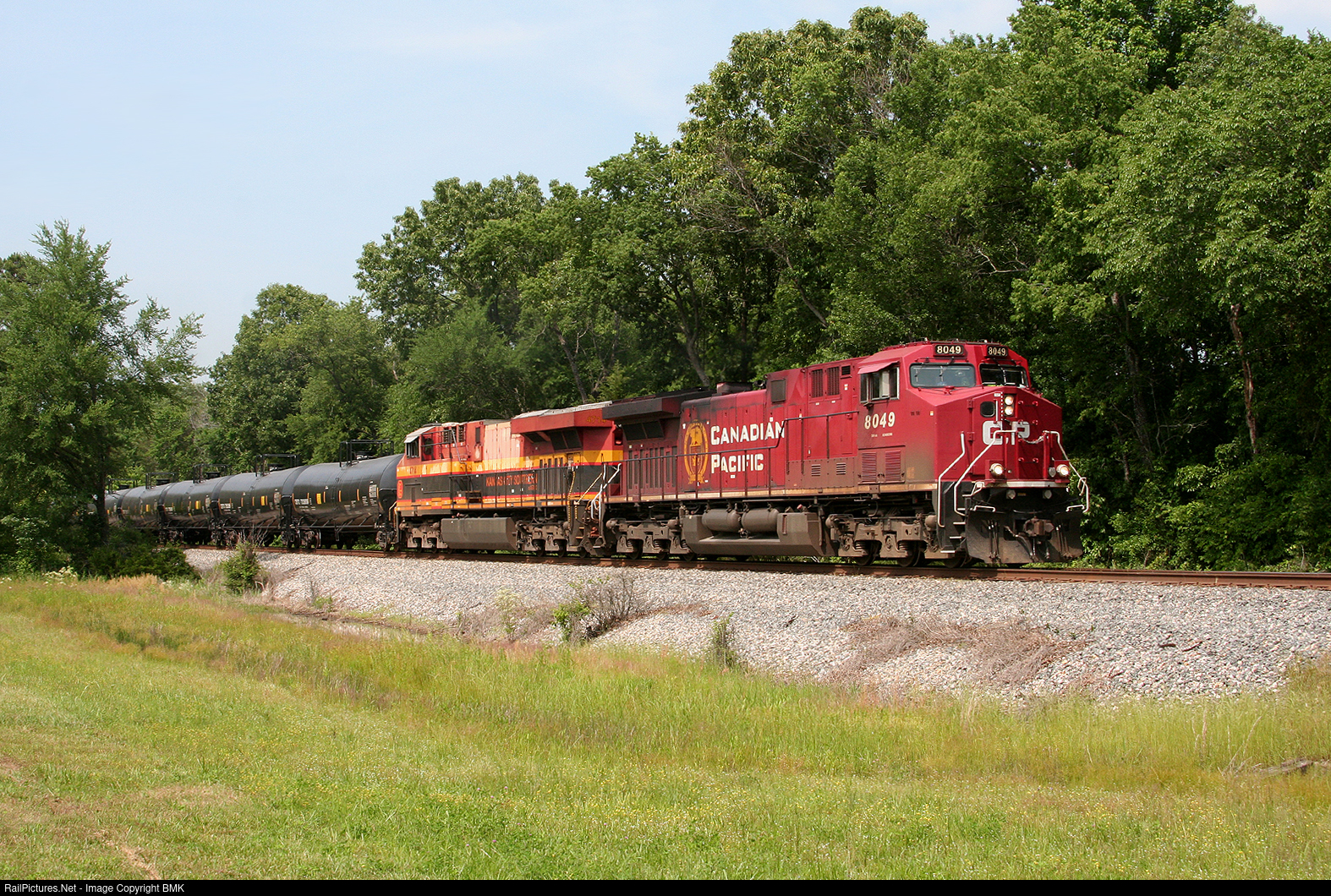 CP 8049 leads a loaded oil train southbound out of Heavener Oklahoma on a beautiful warm spring afternoon.