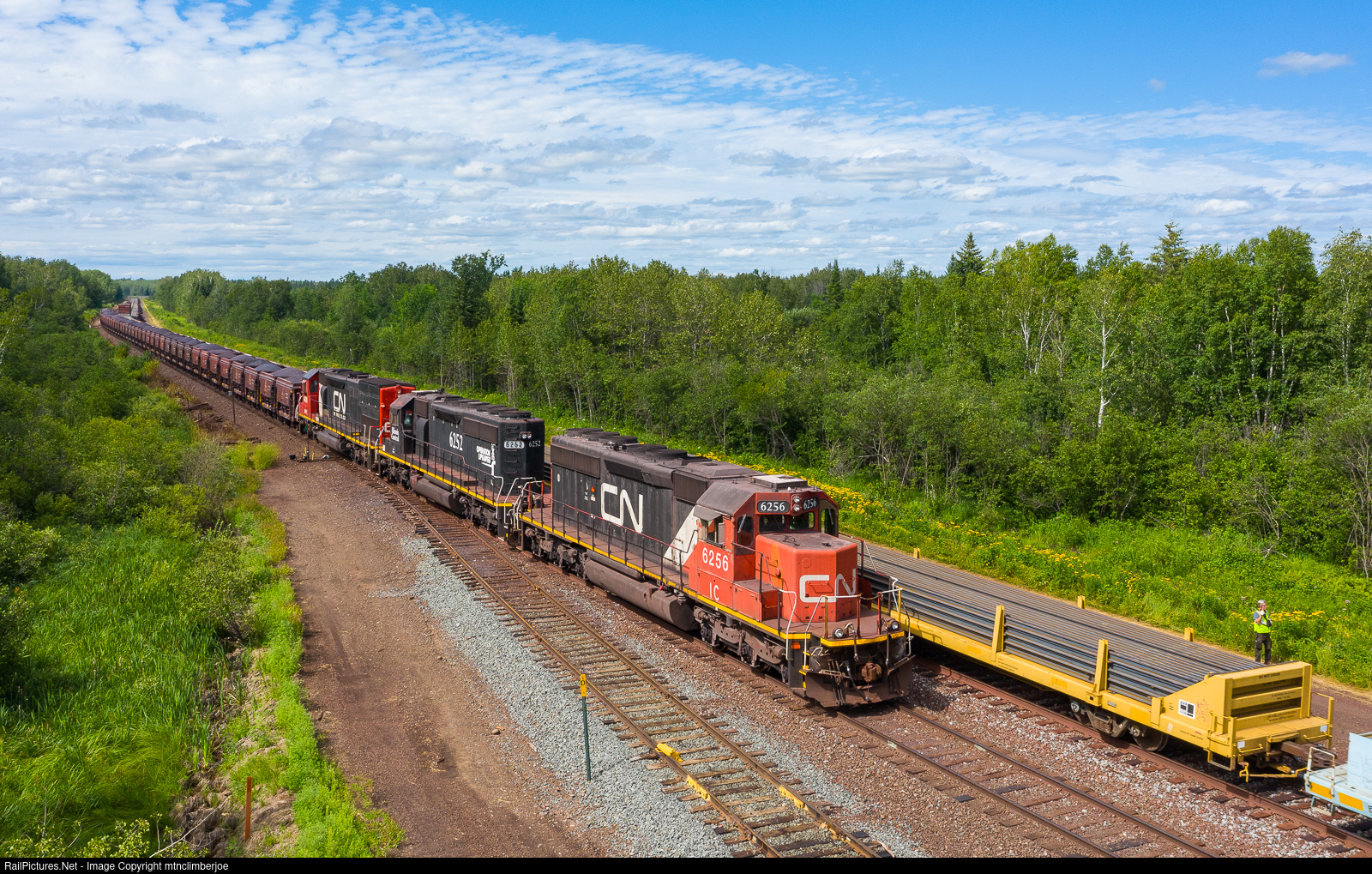 | Loaded CN iron ore train U718 has taken the siding at Alborn, Minnesota and the conductor is on the ground for a roll by inspection of northbound manifest M344, which had a few cars of stick rail in its train. Once the northbound clears, it would only take a few minutes for the ore to get the light and be back on the move to Proctor. |