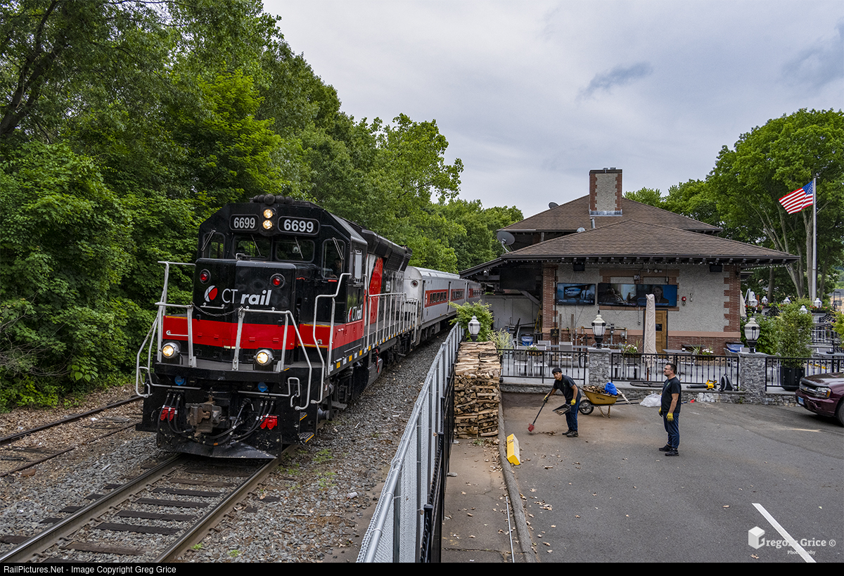 On the morning of June 22nd, 2023, Connecticut Department of Transportation (CTDOT)/CTrail EMD GP40-3H 6699 leads Metro-North Railroad train 1908 into the station stop while passing the former depot-turned restaurant at Naugatuck, Connecticut on the Waterbury Branch. The 6699 is on lease to Metro-North to assist with fleet size while the remainder of their Brookville BL20GHs are sent out for rebuild.