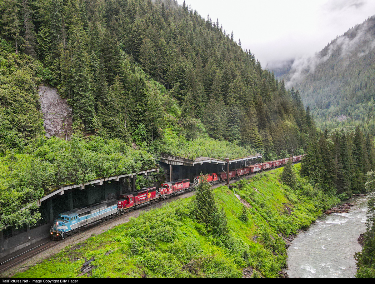 A Central Maine & Quebec SD40-2F leads an eastbound empty ballast train through the snow sheds between Illecillewaet and Flat Creek, BC, just outside of Glacier NP.