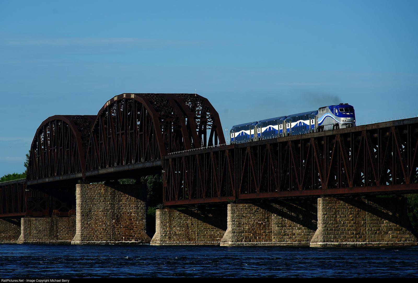 | No more Comets. EXO 1325 lets out some smoke as EXO 74 crosses the St. Lawrence River on CPKC's impressive double track bridge. This line ran exclusively with single level Comet cars until the end of last summer. It now runs with multilevel cars. |