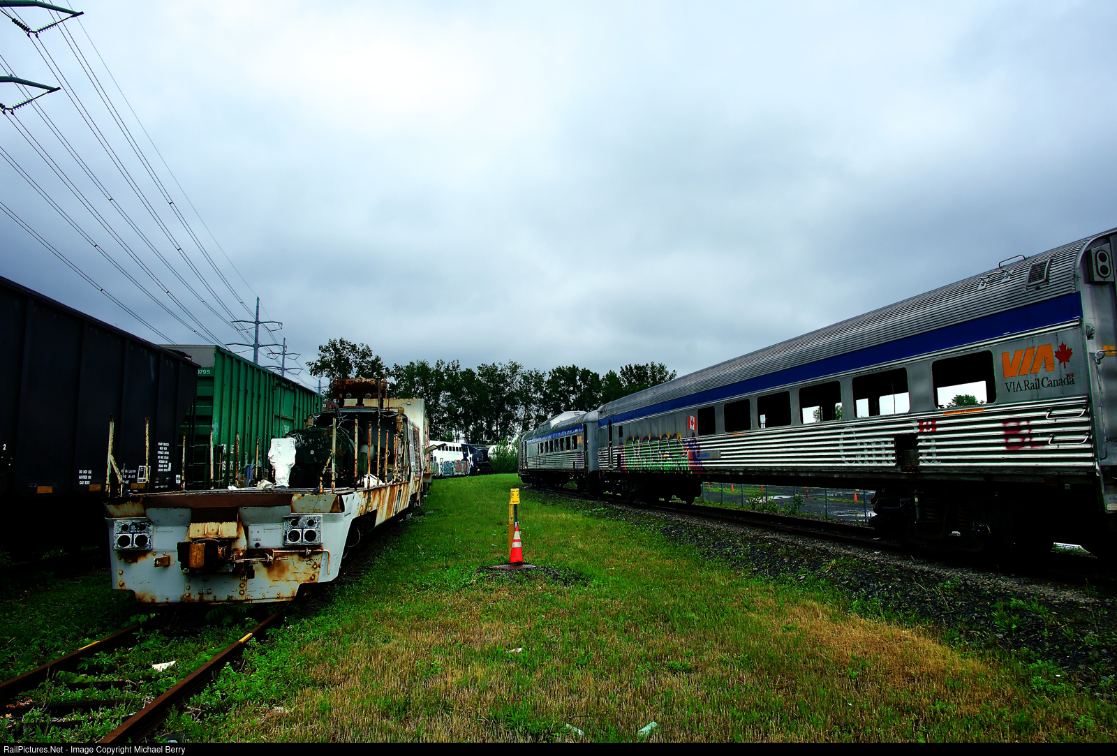 Sacrificed for structural testing, derelict VIA Rail equipment sits at CAD. At left is more ex-VIA Rail equipment - a testbed built on an LRC-3 frame.