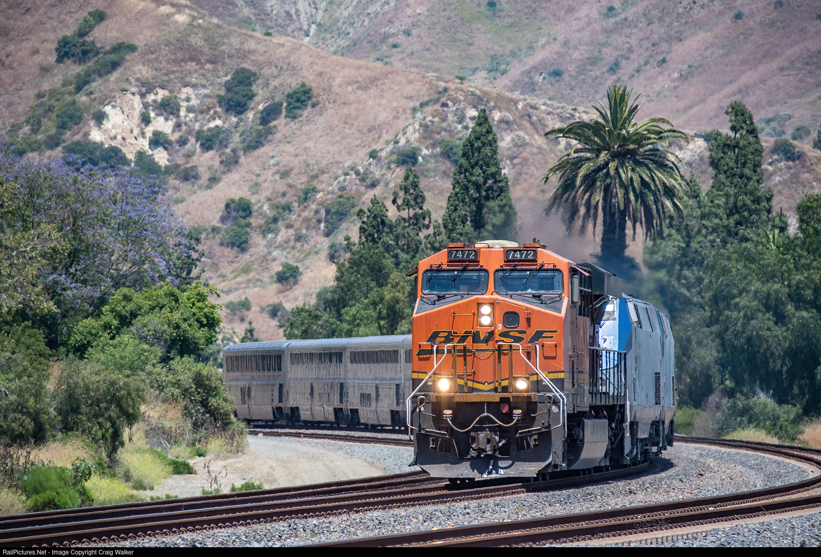 Now that summer has arrived, the green hills have turned into fuel for the wildfires that plague the west each year, but fortunately on this day there were no fires in Santa Ana Canyon (as there were in several other locations nearby). Amtrak train 3, the westbound Southwest Chief is late … again. After Amtrak P42DC 196, this train's lead locomotive, crapped out somewhere in New Mexico, and remaining diesel (AMTK Dash 8-40BP 816) couldn't handle the nine-car train (eight revenue cars plus a deadheading lounge on the rear) on its own, BNSF assigned ES44DC 7472 to help get this train to Los Angeles ... although freight engines have slower gearing resulting it – you guessed it! – an even later Chief! Adding to this train's woes as it passed through southern California was a crew change in Riverside, which took an hour to accomplish. Thus, train 3 was 7 hours 17 minutes late as it passed through Esperanza on BNSF's San Bernardino Sub. In another 13 minutes this train will arrive in Fullerton, its next-to-last stop before Los Angeles. (Yorba Linda, California – June 27, 2023)