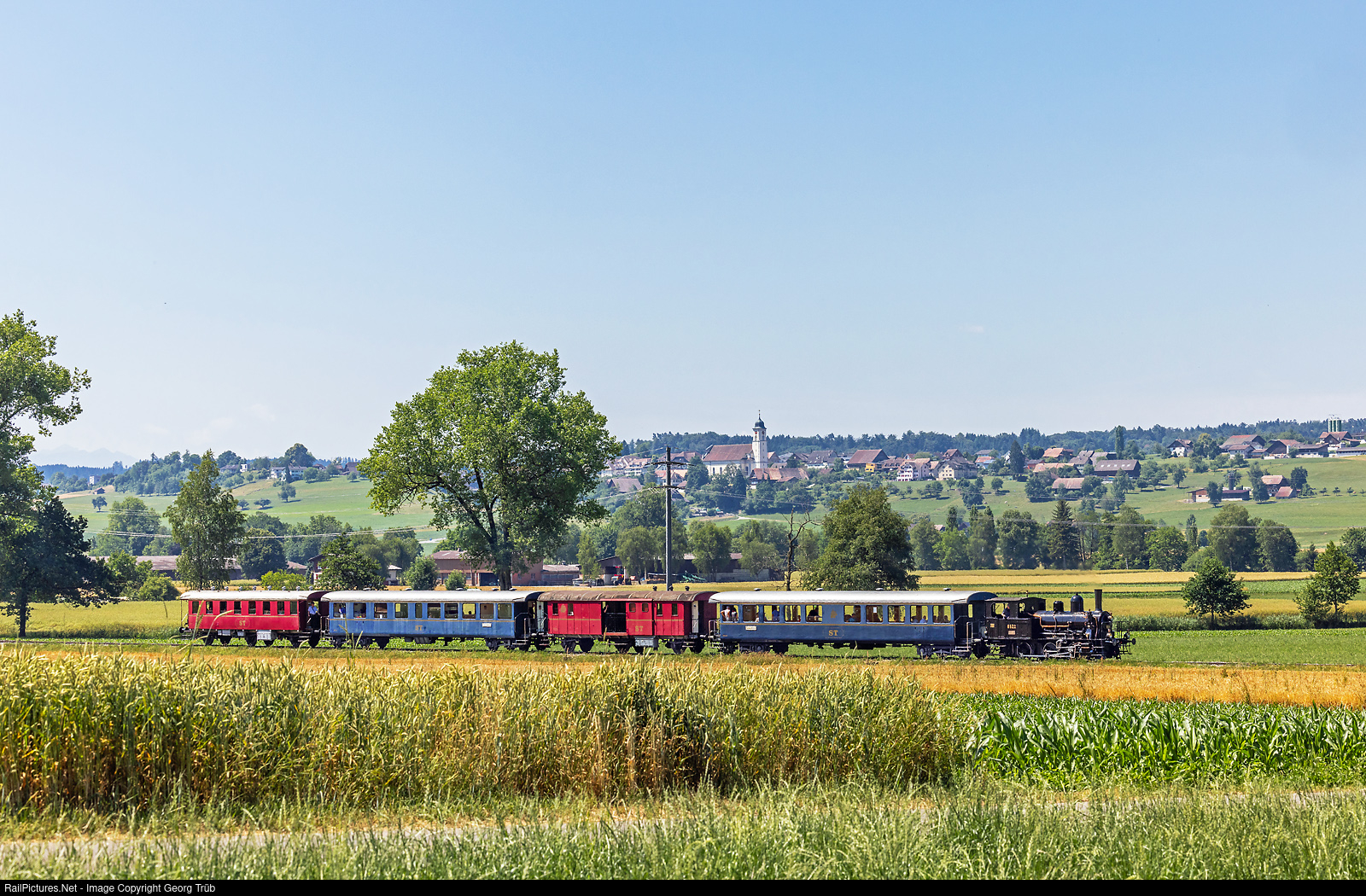 The 0-6-0 T steam shuntinglocomotive E 3/3 "Tigerli" # 8522 of the Sursee-Triengen Bahn (ST) pulls the 11.20 AM train from Sursee to Triengen near Büron-Bad Knutwil. Built in 1913 by the SLM for the SBB. The locomotive was equipped with an electric steam generation system on a trial basis at the SBB workshop in Yverdon on February 11, 1943, due to lack of coal during WW II. This consisted of two electric evaporators, which were fed with current from the contact wire via two transformers. The system was removed again on April 24, 1953 and the locomotive was rebuilt as a normal steam locomotive with coal firing. From 1972 to 1987, the locomotive was in service under the direction of the Verein Dampfbahn Bern. This association took over the locomotive in 1972 and restored it to working order. The locomotive worked off the overhaul costs with the use lasting until 1987 with this association. Since 1987 the locomotive is again in Sursee. From May 2006 to 2008, it was thoroughly refurbished. It received a refurbished exchange boiler, which was previously in use on the E 3/3 # 8483. Over the winter of 2019 / 2020, overhaul work was carried out on the locomotive in Jenbach, Austria, at the Zillertalbahn workshop. In the fall of 2020, the work to bring the locomotive back into service was completed in Sursee and the locomotive was used again for the first time in a long time on the Sursee - Triengen line on September 27, 2020. In the background is the village Knutwil.