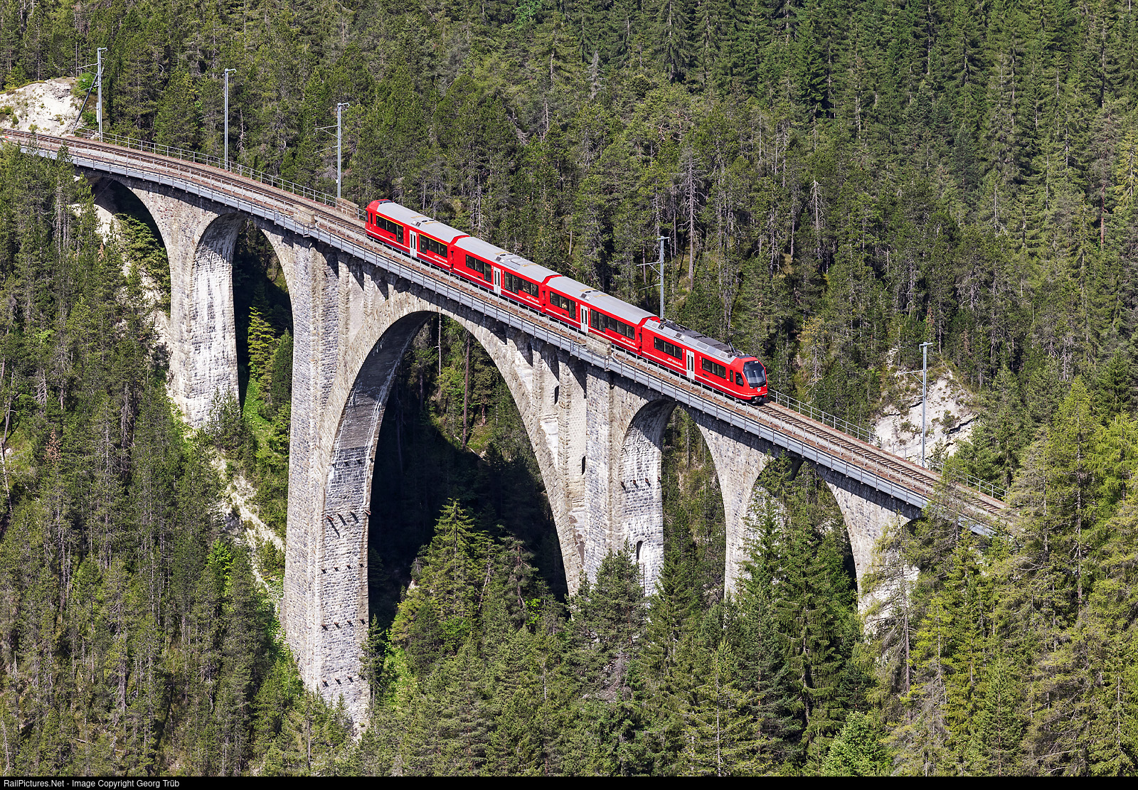 "Capricorn" ABe 4/16 # 3137 of the Rhaetian Railway is crossing the 89 meter high and 210 meter long Wiesener viaduct between Filisur and Davos Wiesen, running as regional train 7816 from Filisur to Davos Platz. Currently, 44 out of 56 of this trains are delivered from StadlerRail.