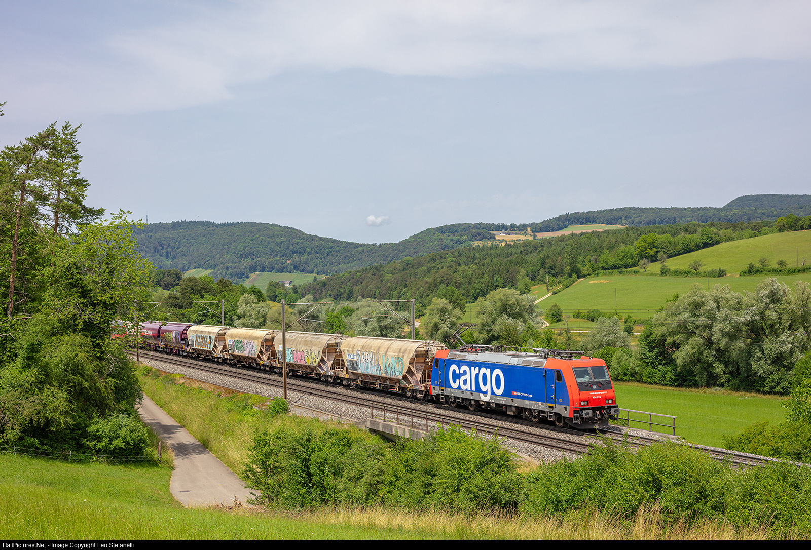 | Bombardier TRAXX Br 484 #019 of the SBB Cargo on the Bözberg north ramp between Hornussen and Effingen. |