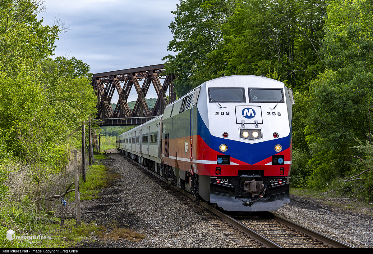 On the afternoon of June 22th, 2023, Metro-North's 40th Anniversary "Beach Ball" heritage-wrapped P32AC-DM, MNCW 208, leads train 943 under the former NYNH&H RR Maybrook-Beacon Line bridge while heading up the Upper Harlem Line in Patterson, New York.