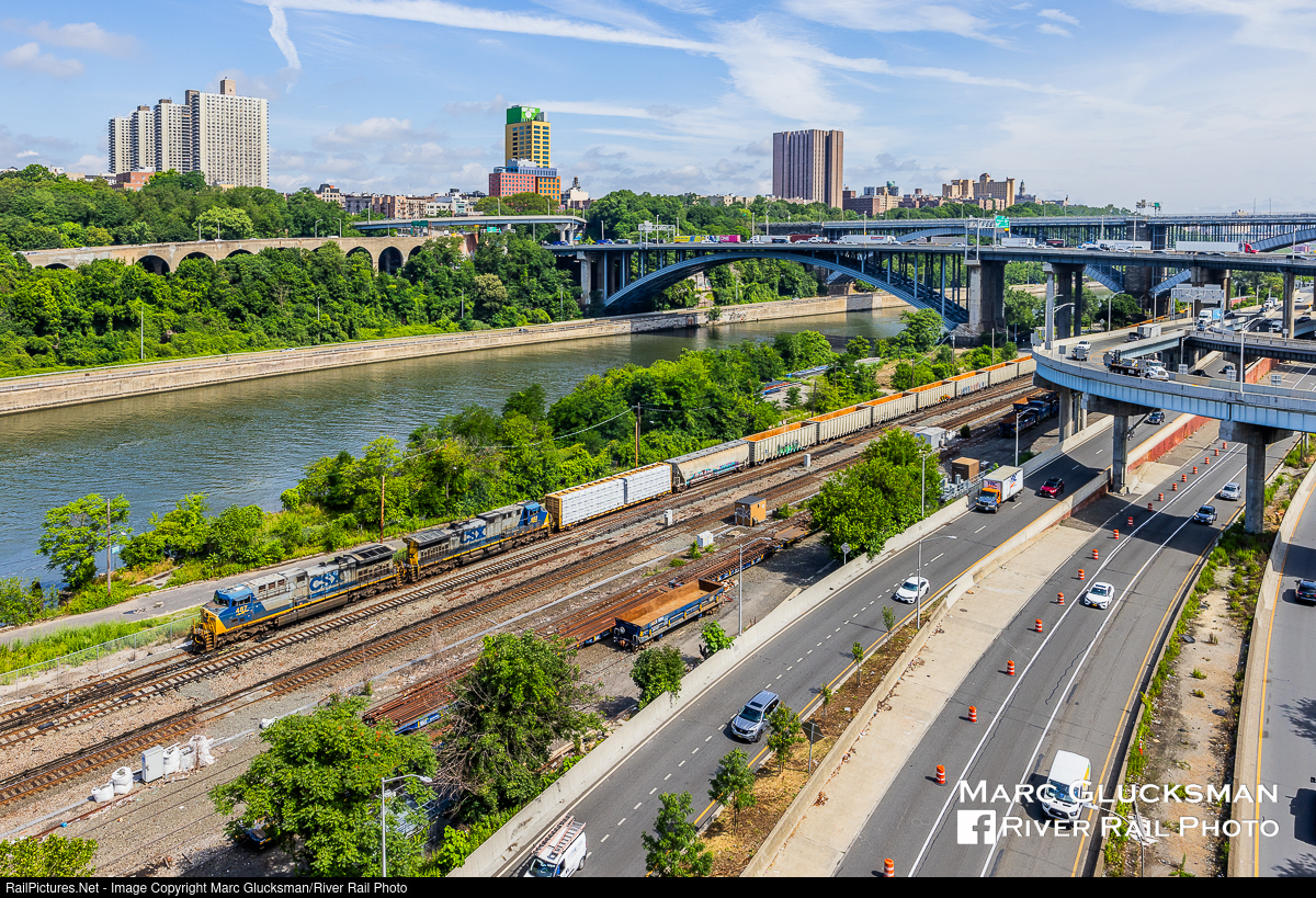 Bridges From The High Bridge. An unusual move occurred on the morning of Wednesday, June 28, 2023, when a pair of "YN2/Bright Future" AC44CWs, CSXT 487 and 482, brought CSX M701-27 south/east in daylight through the High Bridge section of the Bronx, New York. This was the second of 2 freight trains to move through this area in only a few hours as another south/eastbound train had just cleared the area while normally there are no CSX moves at all here in daylight. The MTA Metro-North Railroad Hudson Line here is running next to Interstate 87 (Major Deegan Expressway) and under Interstate 95 (Cross Bronx Expressway) on the Alexander Hamilton Bridge. In the further background is West 181 Street on the "Little" Washington Bridge. The High Bridge opened in 1848, but was closed from 1970-2015. After a major rehabilitation, it re-opened to pedestrians June 9, 2015, making this view possible again for a new generation.