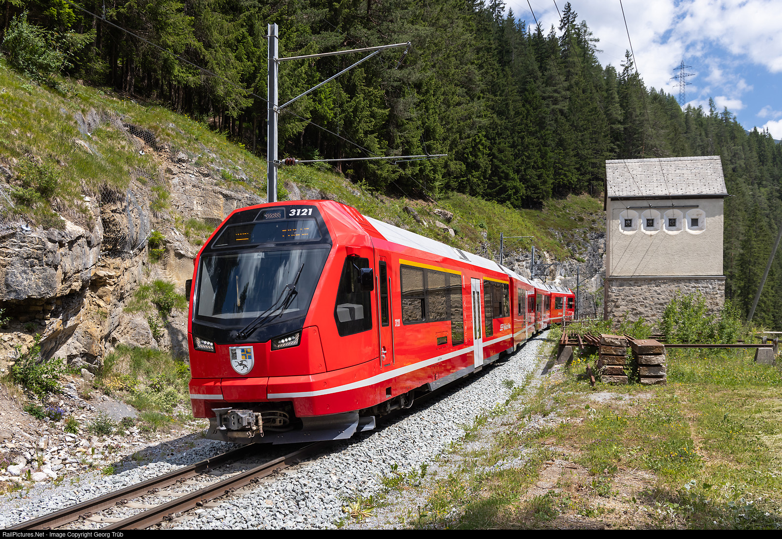 | "Capricorn" ABe 4/16 # 3121 of the Rhaetian Railway is entering Davos Wiesen, running as regional train R 7821 from Davos Platz to Filisur. |