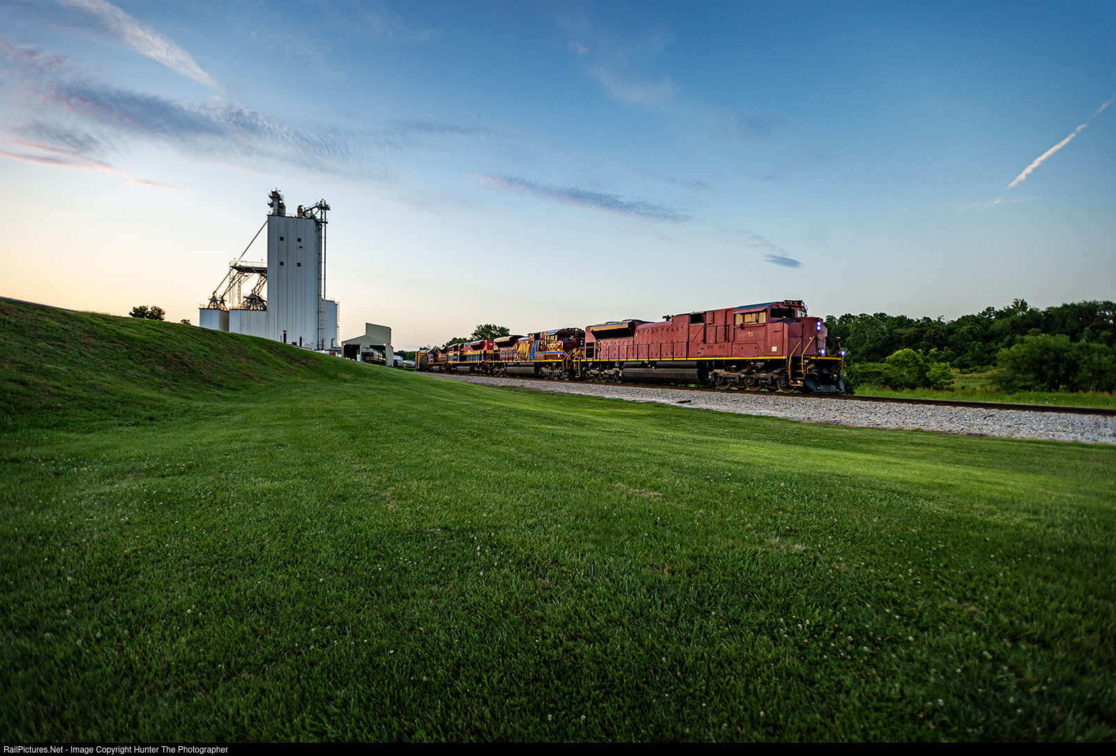 ACes In The Hole | A colorful lashup of four SD70ACes leads the southbound Fort Smith Turn out of Springdale, AR at dusk on a hot Wednesday, June 28, 2023 evening. Despite the different liveries, the four units are all part of the Arkansas & Missouri fleet. While 70 and 72 are painted in the standard AM scheme, 73 still wears its paint from its former owner - the Kansas City Southern. Leading the train is 71, which is in a base coat of red primer, yet to have been repainted after a significant derailment in early 2022. The turn - labeled FSTN - has just begun their overnight journey and is seen here passing a Tyson Foods mill.