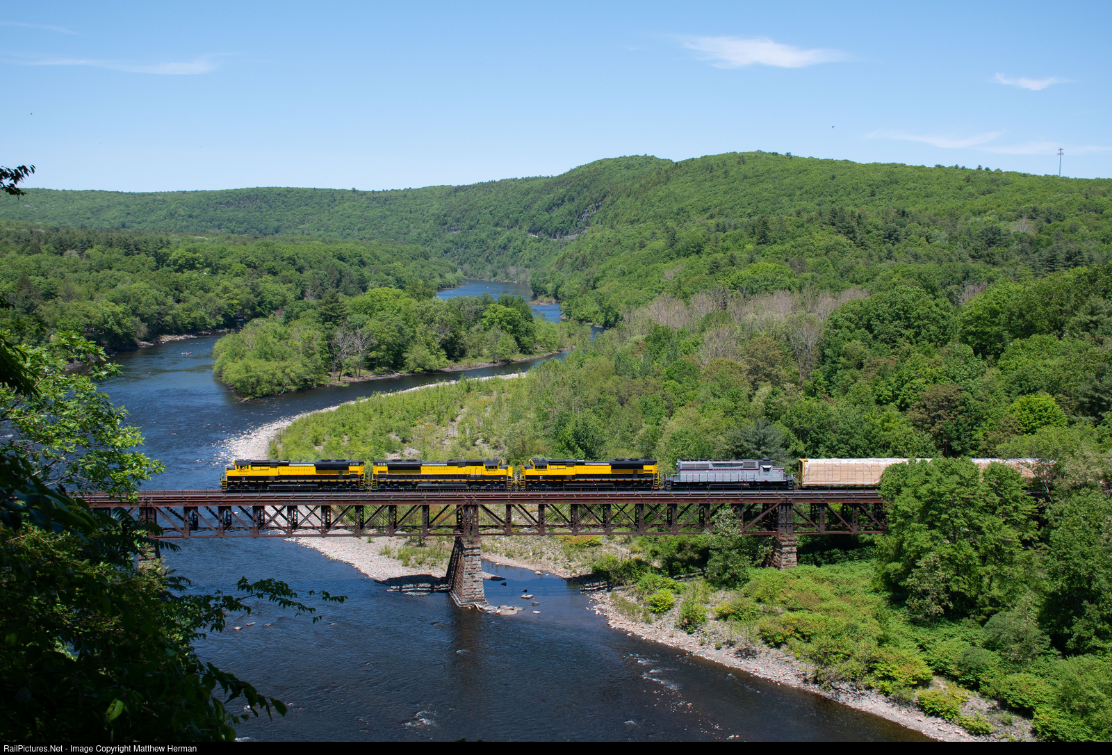 After being out of service and undergoing emergency repairs for the last month, Millrift Viaduct is now back in service, seen here as the SU99 crosses over the Delaware River into Pennsylvania. The normally nocturnal SU99/SU100 ran in daylight over the last two days to allow the contractors a chance to see a train safely cross the bridge.