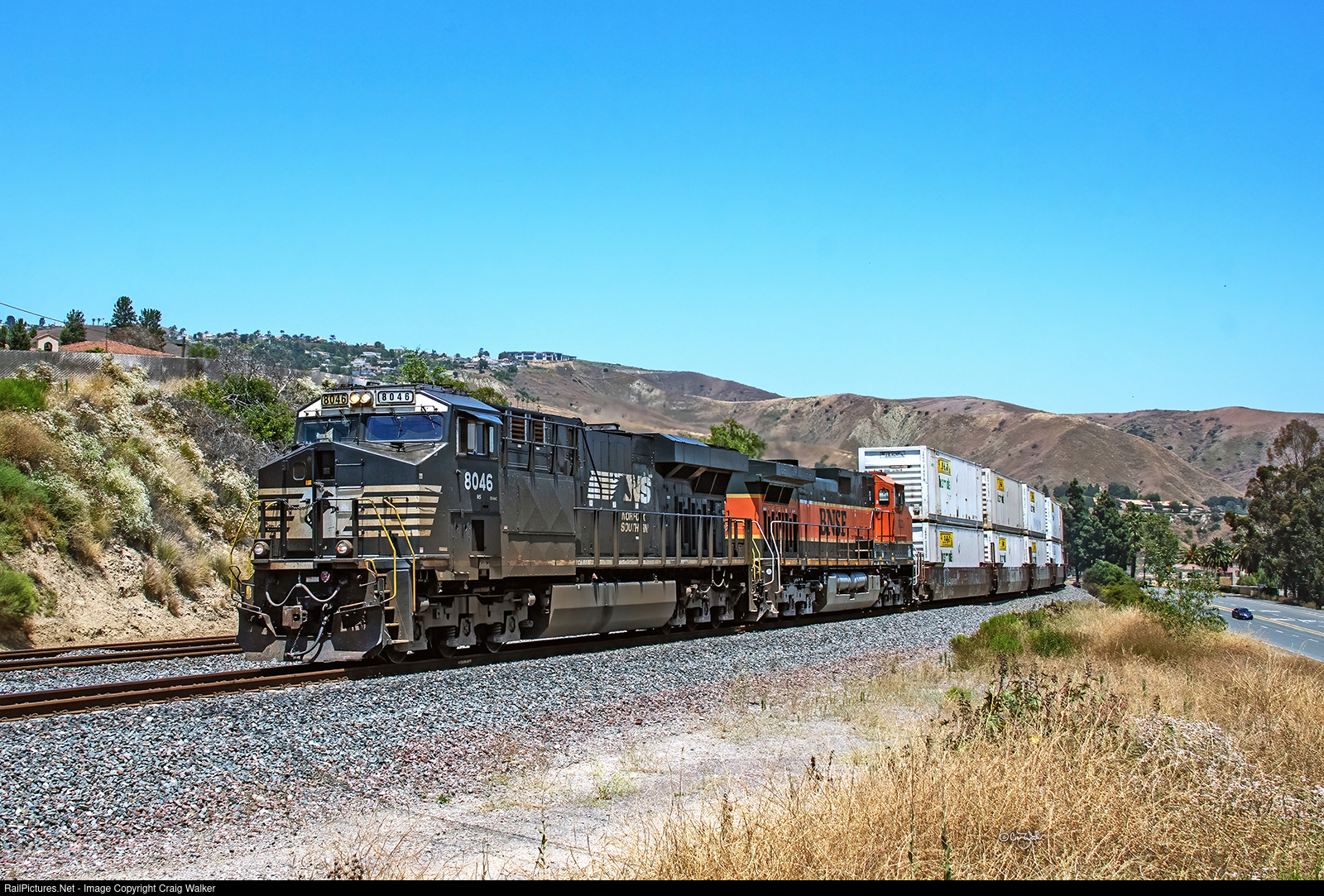 BNSF Railway Guaranteed Service Intermodal train Q-ATGLAC6-23A, heading from Atlanta, Georgia, to Los Angeles, isn’t very long this day, warranting only two diesels. But with a Norfolk Southern diesel up front (ES44AC 8046), teamed with BNSF Dash 9-44CW 1021 in the original scheme from 1996, the train is worth a second look. And a photo! (Yorba Linda, California – June 27, 2023)