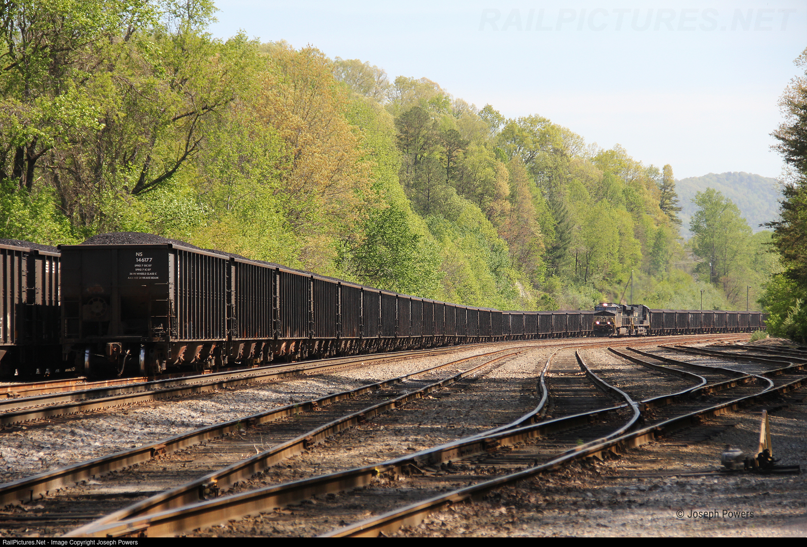 Eastbound Norfolk Southern train U40 is coming into the yard at Frisco, Tennessee. The train is actually in Virginia as the Tennessee-Virginia state line is between the train and the photographer. The train will set out its 37 loads of coal here, and the crew will take the locomotives light back to Andover, Virginia.