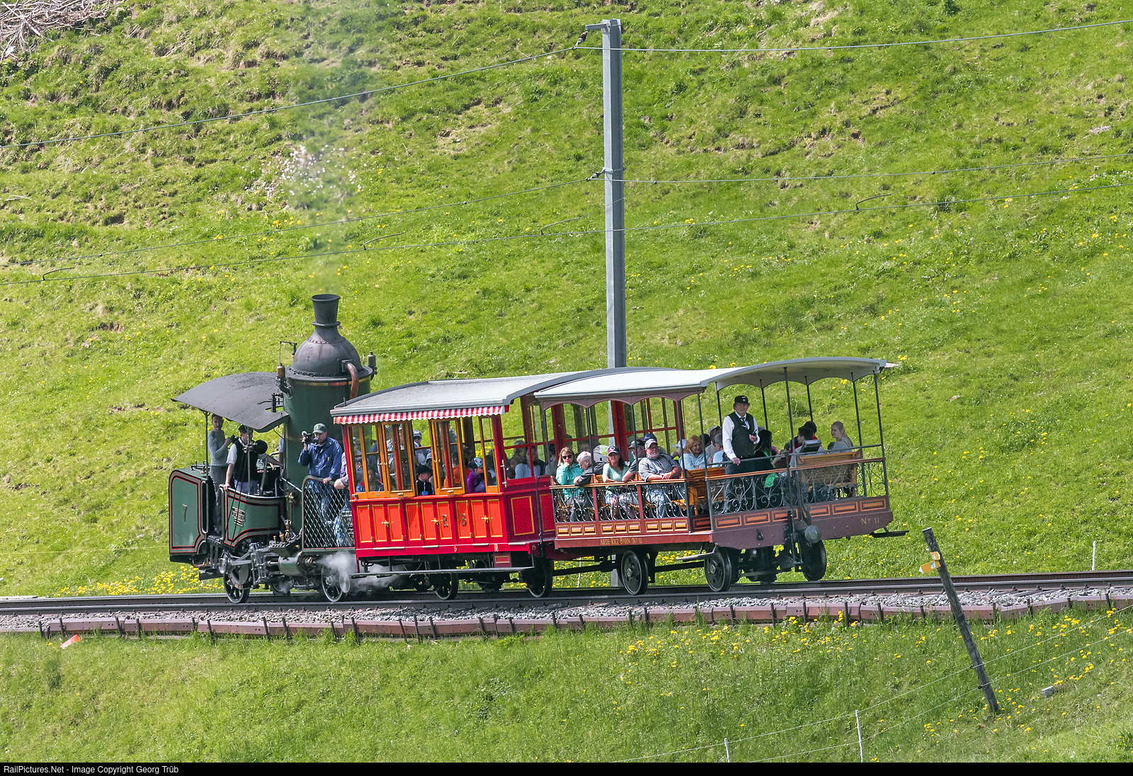 Today, first of july, the unique cogwheel steamlocomotive with upright boiler, H 1/2 # 7, can celebrate the 150th birthday. So it has no duty today. But on Pentecost, she was pushing two cars up the mountain from Arth Goldau to Rigi Kulm, here between Wölfertschen-First and Rigi Staffel. The locomotive was built by the SLM in Winterthur in the year 1873 for the Rigi Bahn from Vitznau to the Rigi, and was the very first locomotive built by the new founded SLM. The locomotive was more or less a copy of the locomotives # 1 to # 6 of the Rigi Bahn, which were delivered by the workshop of the Schweizerische Centralbahn (SCB) in Olten in 1871 and designed by Niklaus Riggenbach, which built the Rigi Bahn.