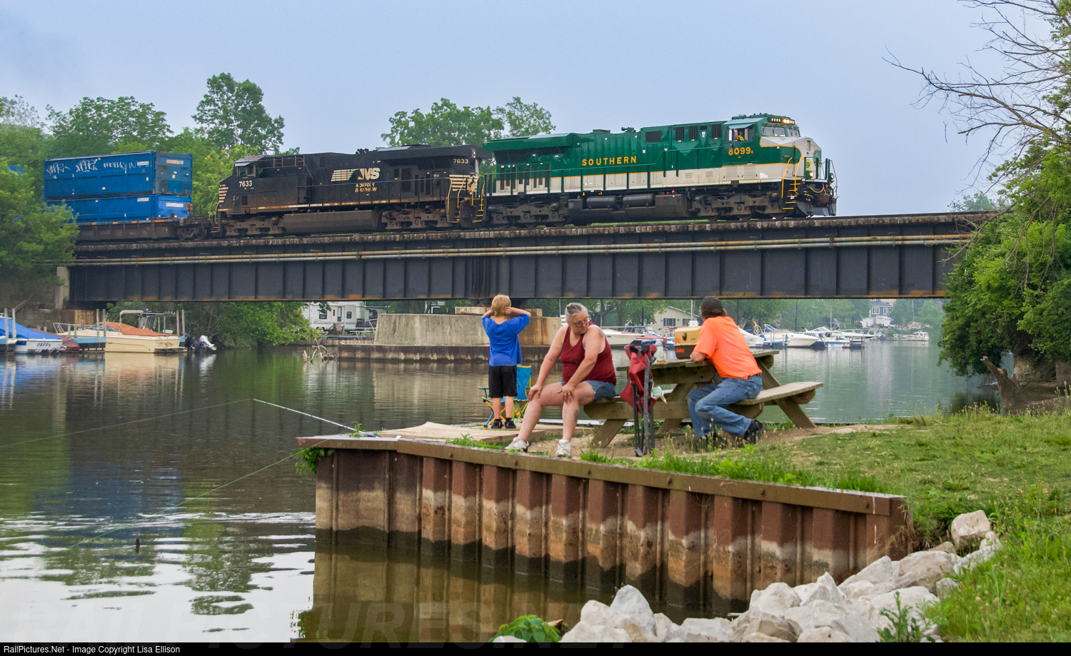 NS 8099, the Southern Heritage Unit, leads train 315 through the wildfire smoke haze and across the Nickel Plate Bridge in Vermilion, Ohio. Engineer Danny Whitt can be seen waving from the train, while the little boy, apparently not a fan of train horns, covers his ears.