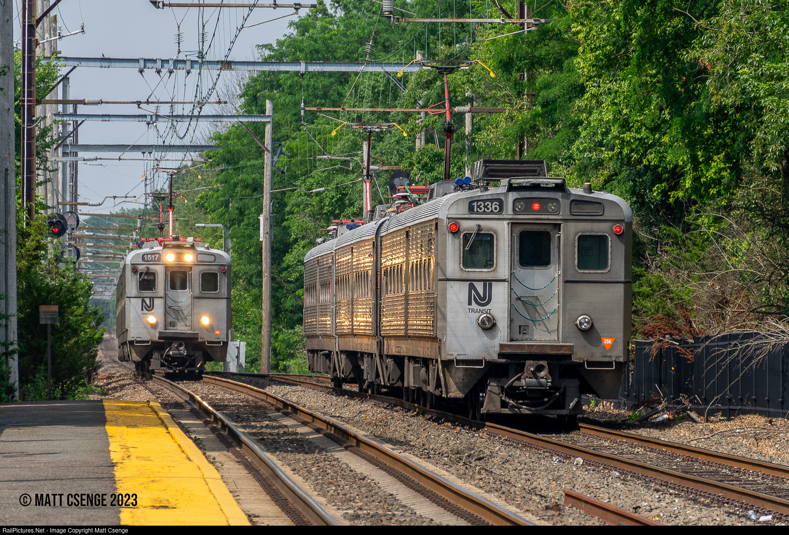 Glint on Gladstone. Two NJ Transit trains of Arrow III cars (GE, 1977-1978) are seen passing near Murray Hill Station on the Gladstone Branch, with some nice glint from the headlights of no. 1517. The mainly single-track branch has four controlled sidings at Murray Hill, Stirling, Bernardsville, and Far Hills where revenue trains can pass. There are also sidings at Berkeley Heights and east of Lyons Station, but these are single-ended and non-controlled, respectively.