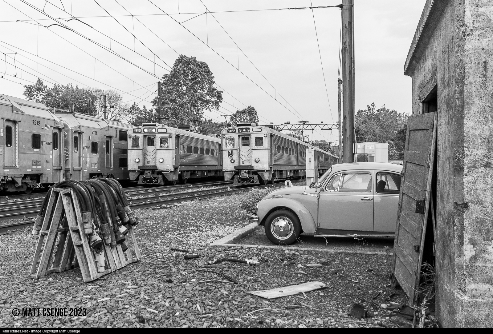Late Seventies in Gladstone Yard. NJ Transit Arrow III car no. 1310 is the lead unit on a westbound Gladstone Branch train passing other equipment as it pulls through the yard approaching its final station: Gladstone. The 1973 Volkswagen Beetle parked near the yard caught my eye and fits perfectly with the Arrow III cars seen here, which were manufactured by GE from 1977-1978; the MultiLevel coaches are the only obvious clue that this photo wasn't taken in the 1970s!