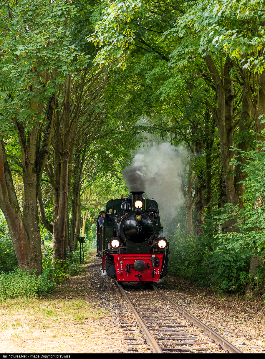 | Narrow gauge steam locomotive # 20 (1,000 mm), named 'Haspe' and build by JUNG in 1956, approaches the station of Birgden through the trees tunnel. |