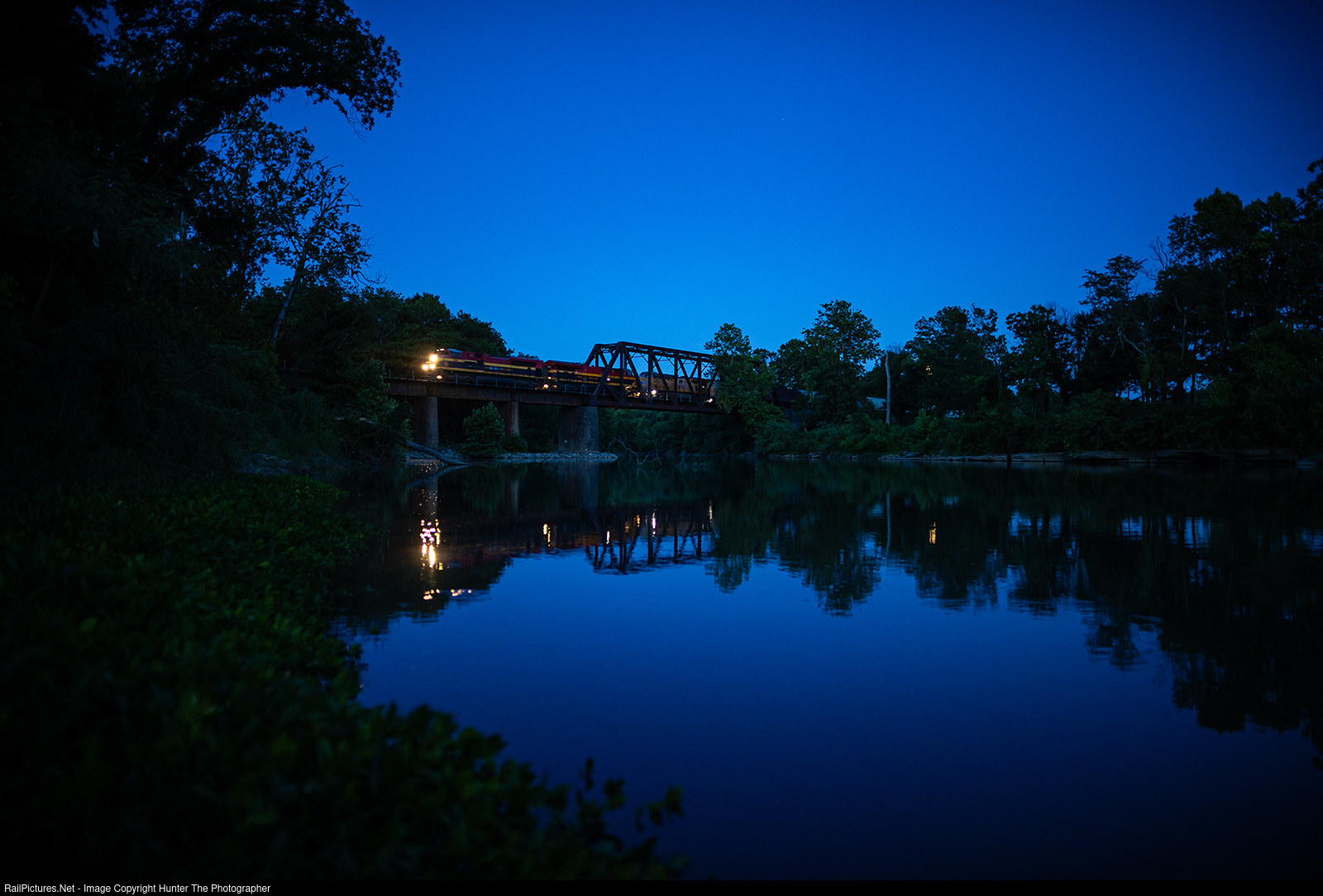 Blue Hour At The Bridge | Northbound CPKC empty grain train G387 rolls across the bridge over the Illinois River near Watts, OK on the warm and humid evening of Sunday, July 2, 2023.