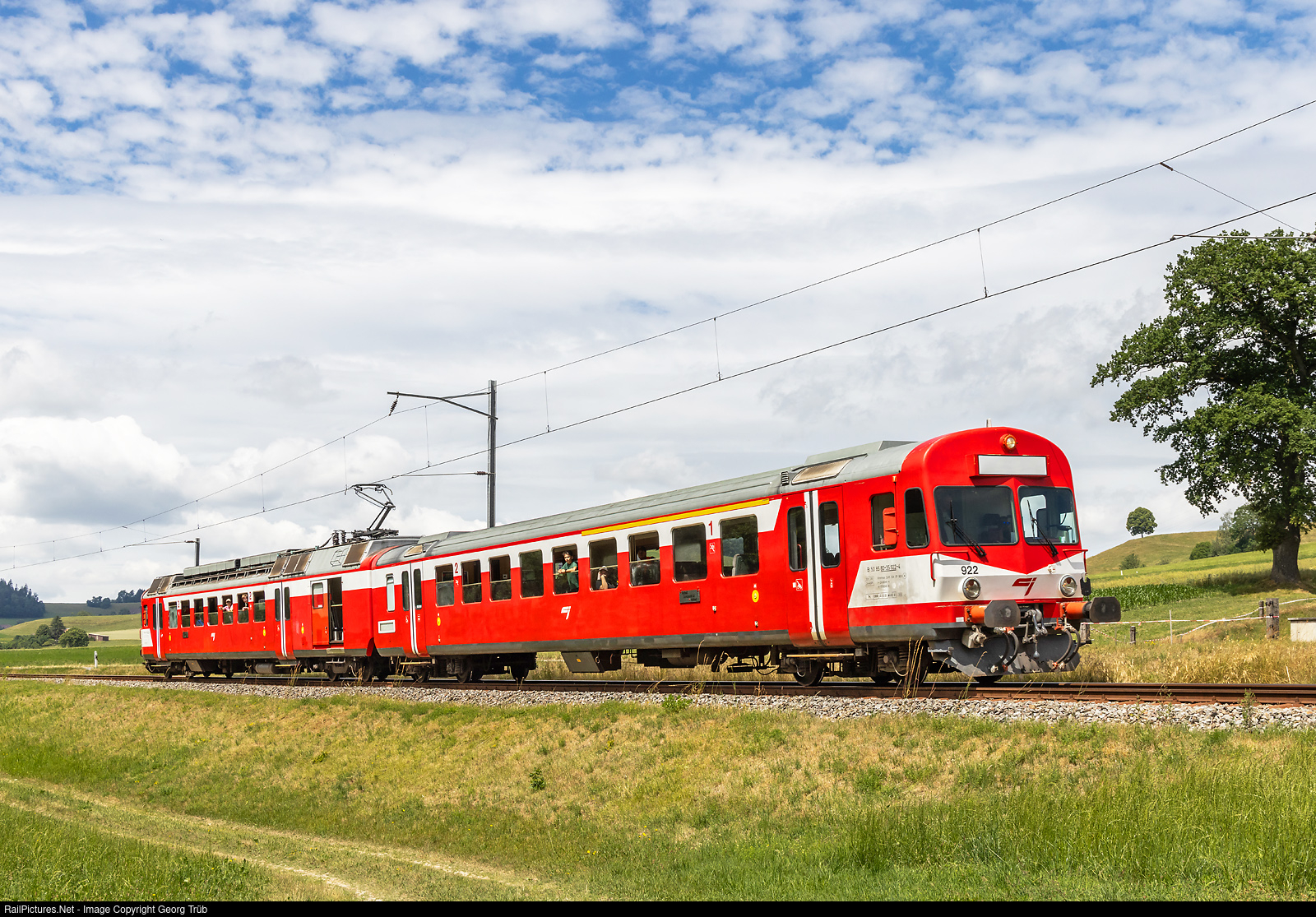 The new push-pull train of association Pendelzug Mirage (VPM), with railcar RBDe 566 I # 222 and cab car ABt # 922, is running as train 39992 from Sumiswald-Grünen to Huttwil near the former stop of Mussachen, on the occasion of the Handwerkermarkt in Huttwil. This train was taken over from the Chemin de Fer du Jura (CJ), line Porrentruy-Bonfol. It was built in 1973 in a series of 8 for the Emmental-Burgdorf-Thun-Bahn (EBT), Vereinigte Huttwil-Bahnen (VHB) and Solothurn-Moutier-Bahn (SMB) as RBDe 4/4 with ABt.