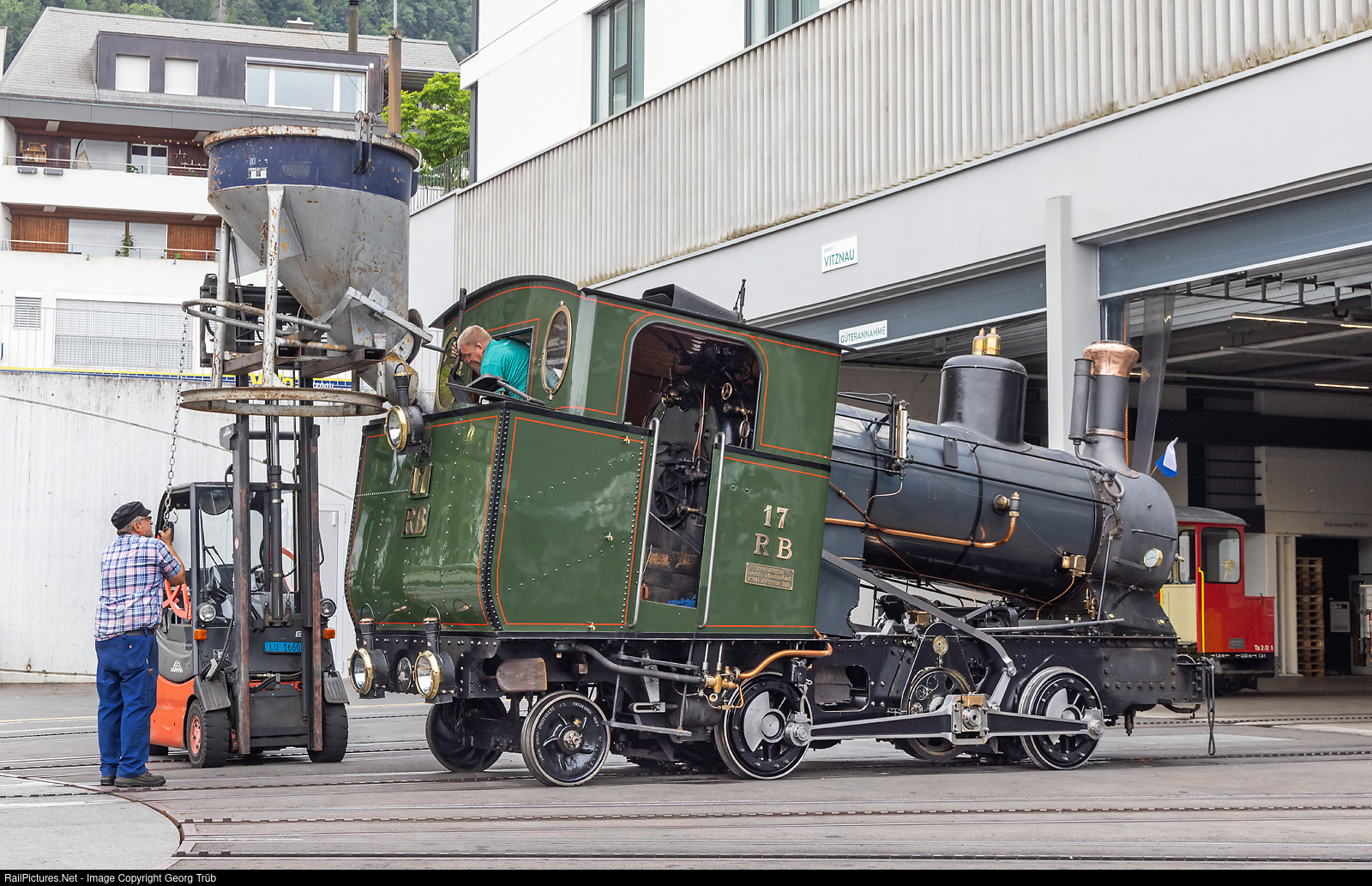 The cogwheel steamlocomotive H 2/3 # 17 of the Rigi Bahnen, built in 1925 by the SLM, is beeing loaded with coal in front of the shed in Vitznau, for the following evening trip up to Rigi Kulm and down to Arth Goldau.