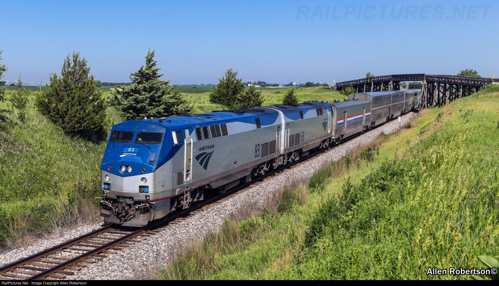 | Running approximately 8hrs & 42mins late, AMTK 83 & 68 lead the eastbound California Zephyr at MP 168 on BNSF's Hastings subdivision. |