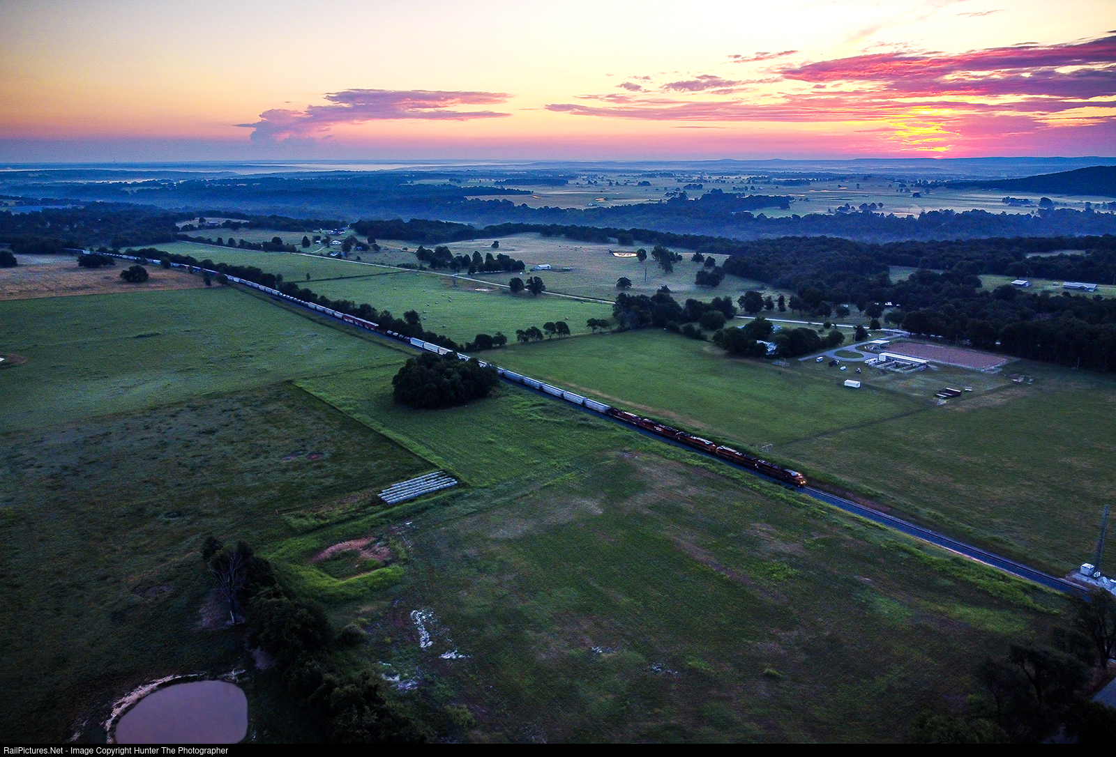 Fiery Sky On The Fourth Of July | The sun has just begun to show itself on the morning of Tuesday, July 4, 2023 as southbound manifest train M262 cruises through some fields just north of Westville, OK.
