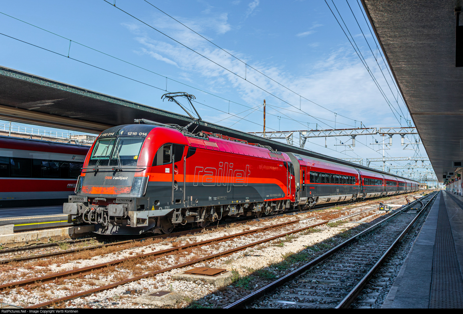 | ÖBB Railjet high speed service from Venice to Wien waiting for it's departure time at Venezia Santa Lucia station. Pushing the train today is Siemens ES 64 U4 number 1216 014 |