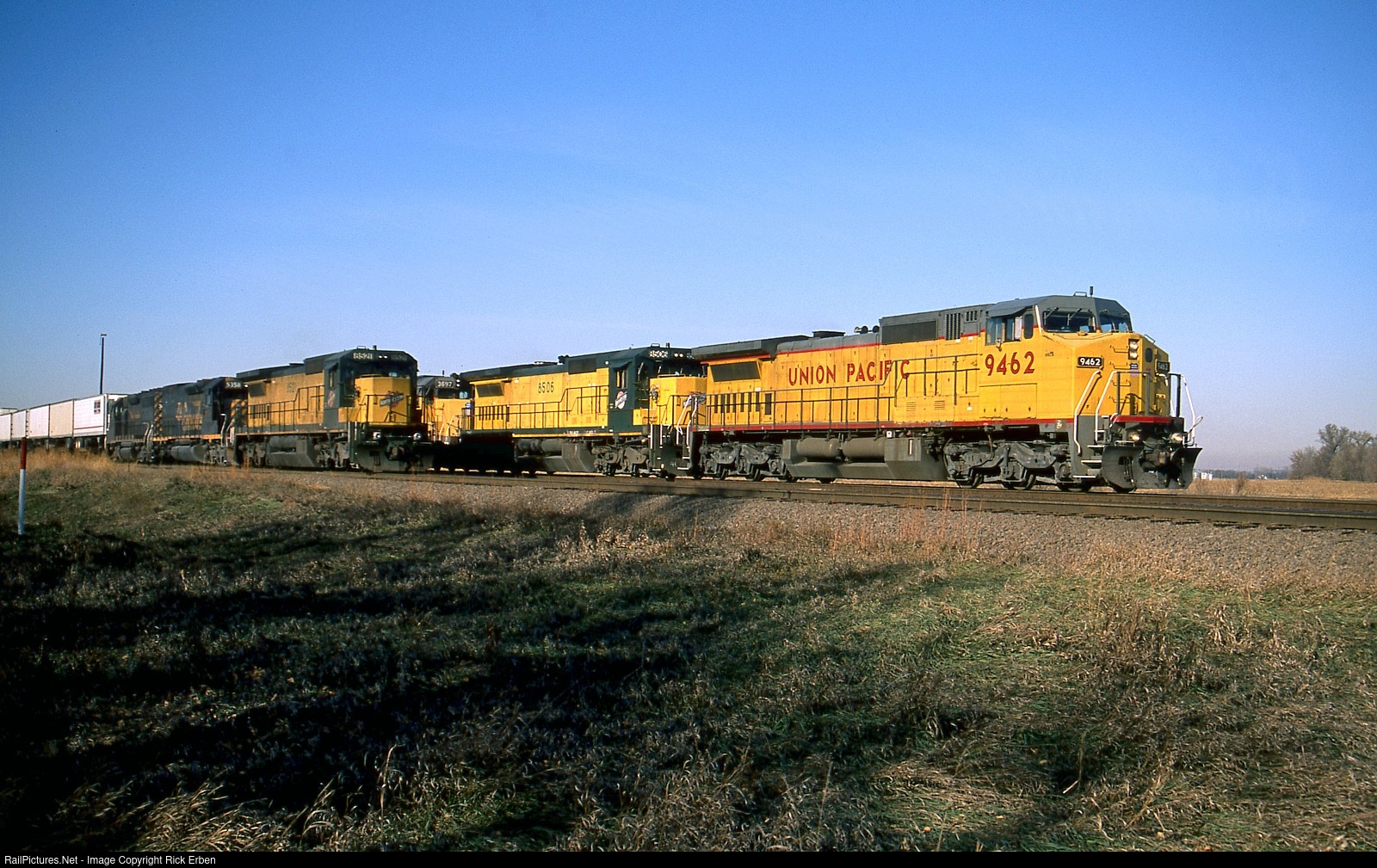 When traffic was heavy through Fremont, NE one could often see trains parked east of town awaiting a crew change to take them on toward Boone, IA and beyond. A pair of eastbounds patiently wait. The 9462 has a C&NW Dash8-40C and an SD40-2 and the C&NW 8521 has a Rio Grande SD40T-2 and GP40 in the consist. This was not as disadvantageous for westbound traffic as it might seem, as those trains usually arrived via the former C&NW line via Blair, NE that joined the mainline a couple miles farther to the west. Fuji Velvia.