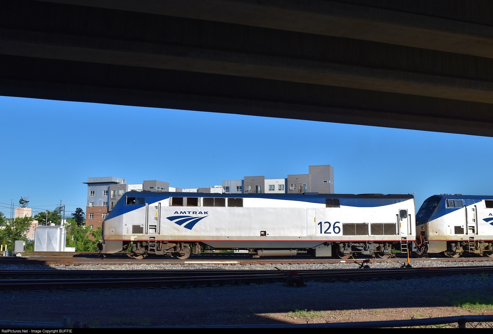 | Amtrak engine #126 (P42DC) leads the California Zephyr past some apartments in lower downtown Denver as it heads towards Union Station.