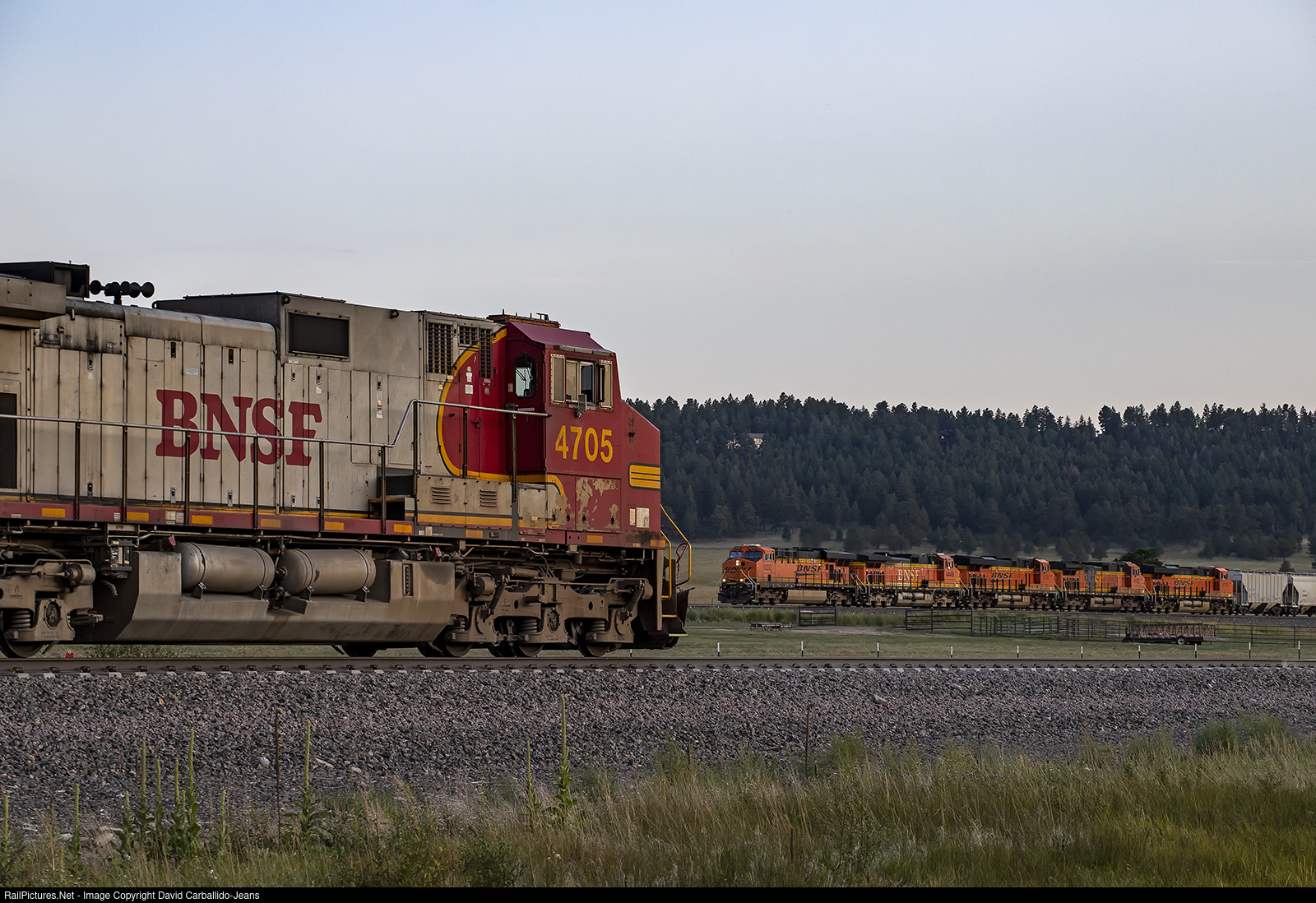 | BNSF 4705 holds at "The Sag" for a fleet of northbound traffic as they clear the single track section of the Pikes Peak Sub. In the background, the second of three northbound manifest passes on main track two towards Greenland. |