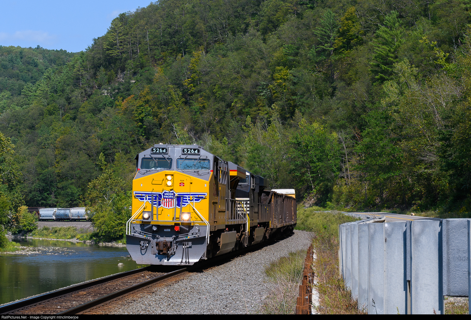 Norfolk Southern's manifest freight 316 cruises down the Southern Tier in the heart of the Canisteo River Valley, following the river through Rathbone, New York. On the point is a freshly repainted Union Pacific ES44AC, wearing one of the early iterations of UP's new paint scheme. This unit retained the wings on the nose, but has the block letter "Union Pacific" on the long hood as well as lacking the flag on the cab sides.
