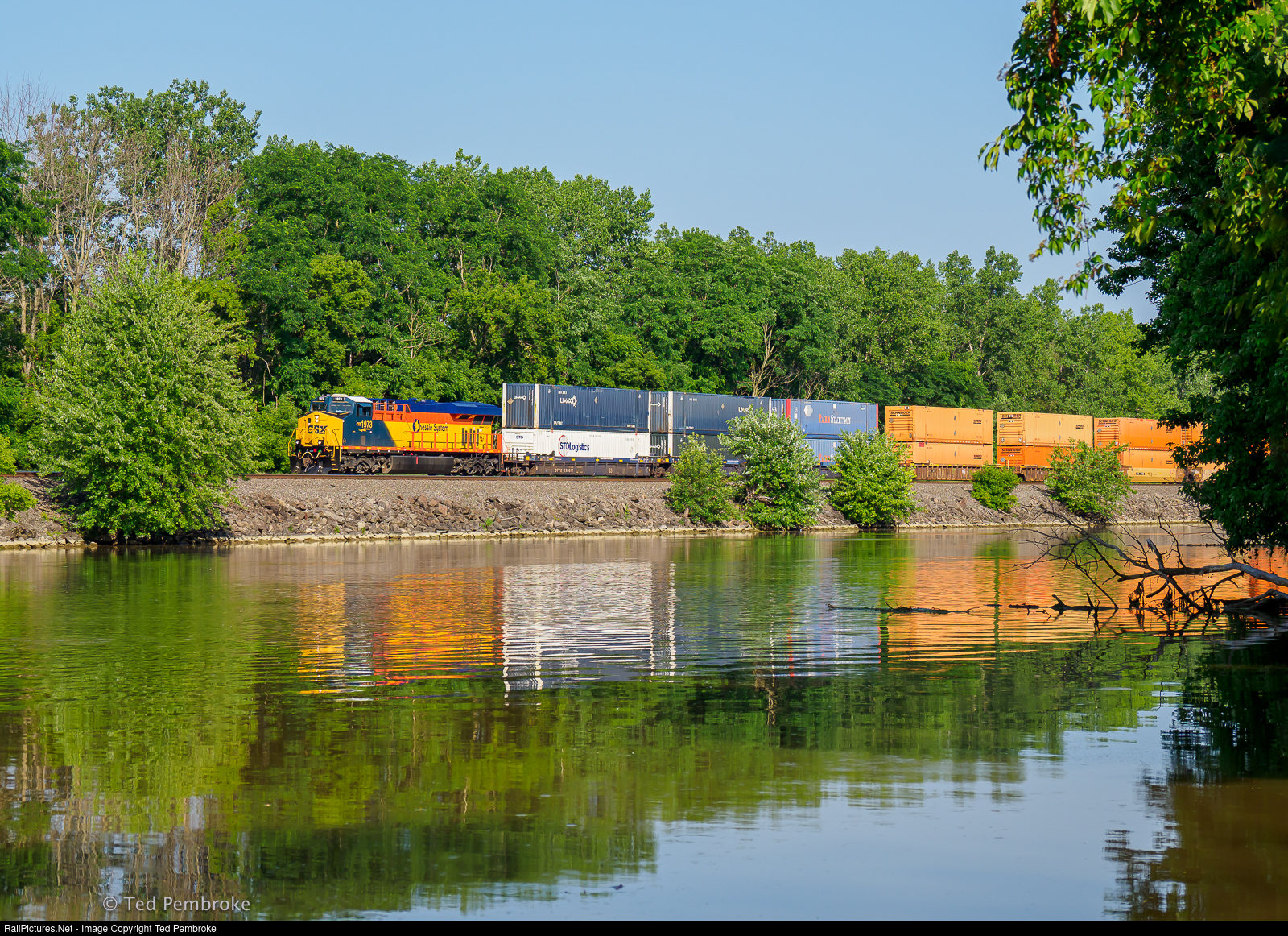 | 157 Westbound intermodal with CSXT 1973, one of three recently released Heritage locomotives. This repainted GE ES44AH sports the Chessie System logo. CSX decided to make Heritage units with a traditional YN3 type cab paint that "fades" to the livery scheme of the the fallen flag railroad. |