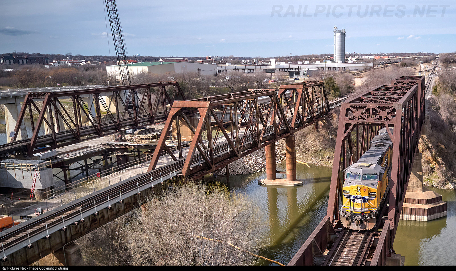 Power move on the Duncan Subdivision of Union Pacific. The nearest bridge is the UP Duncan Subdivision followed by UP Choctaw Subdivision and last one is the BNSF Fort Worth Subdivision. Between the BNSF and the UP bridges, one can notice a new bridge being constructed and this is being constructed by BNSF. The Power move most likely is a transfer job to Wabtec Facility at Justin, Tx for rebuilds.
