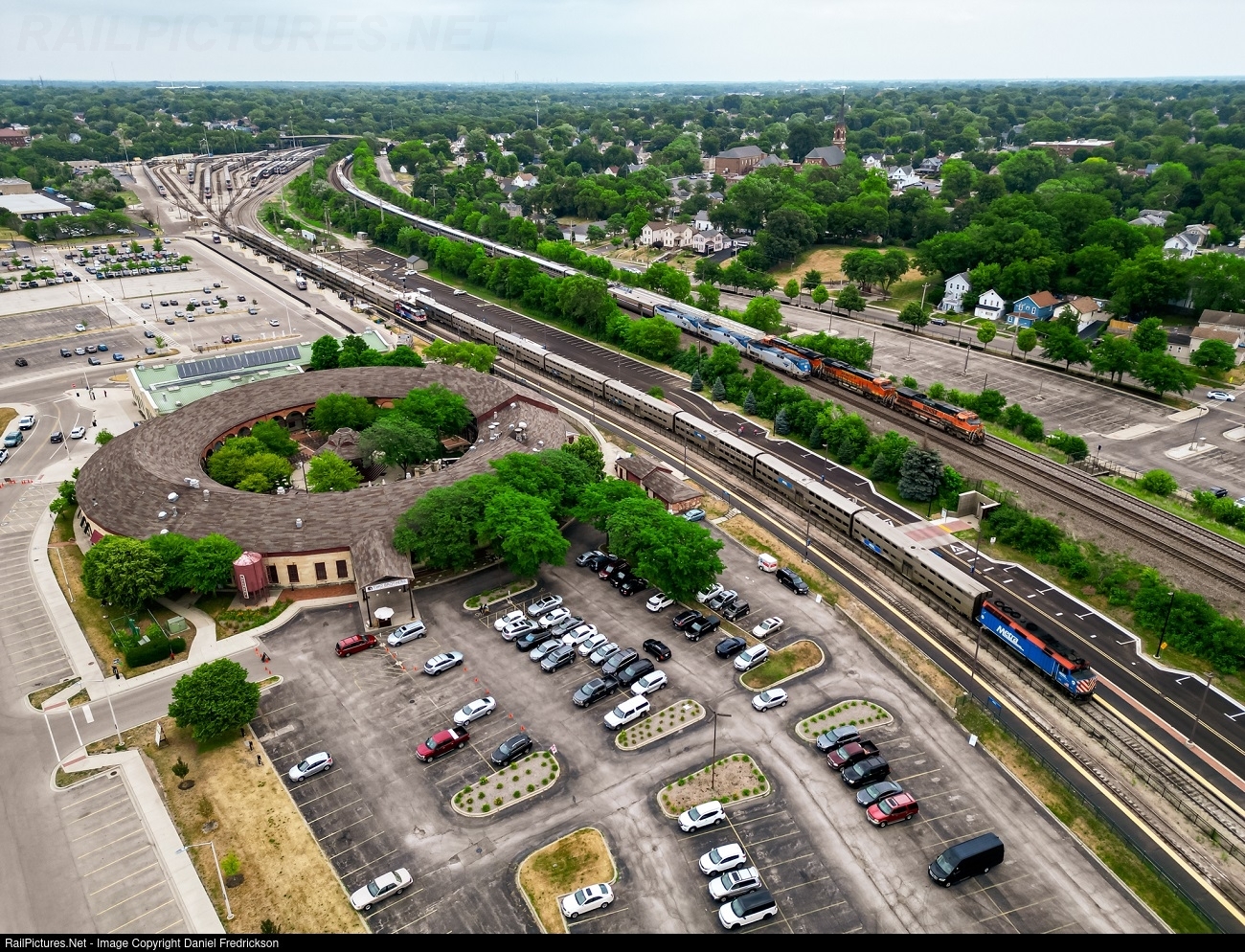 Lot of activity going on in this one! A Metra commuter train sits outside the Aurora Transportation Center and Two Brothers Roundhouse in Aurora, IL, waiting for its call to duty, while an outbound Metra train has just finished dropping off passengers and is making its way back to the yard in the background. Up above is BNSF train H-BRCKCK with BNSF H1 1006 in the lead, waiting for Amtrak 3, the Southwest Chief, to go around. Busy times on this end of the Racetrack!