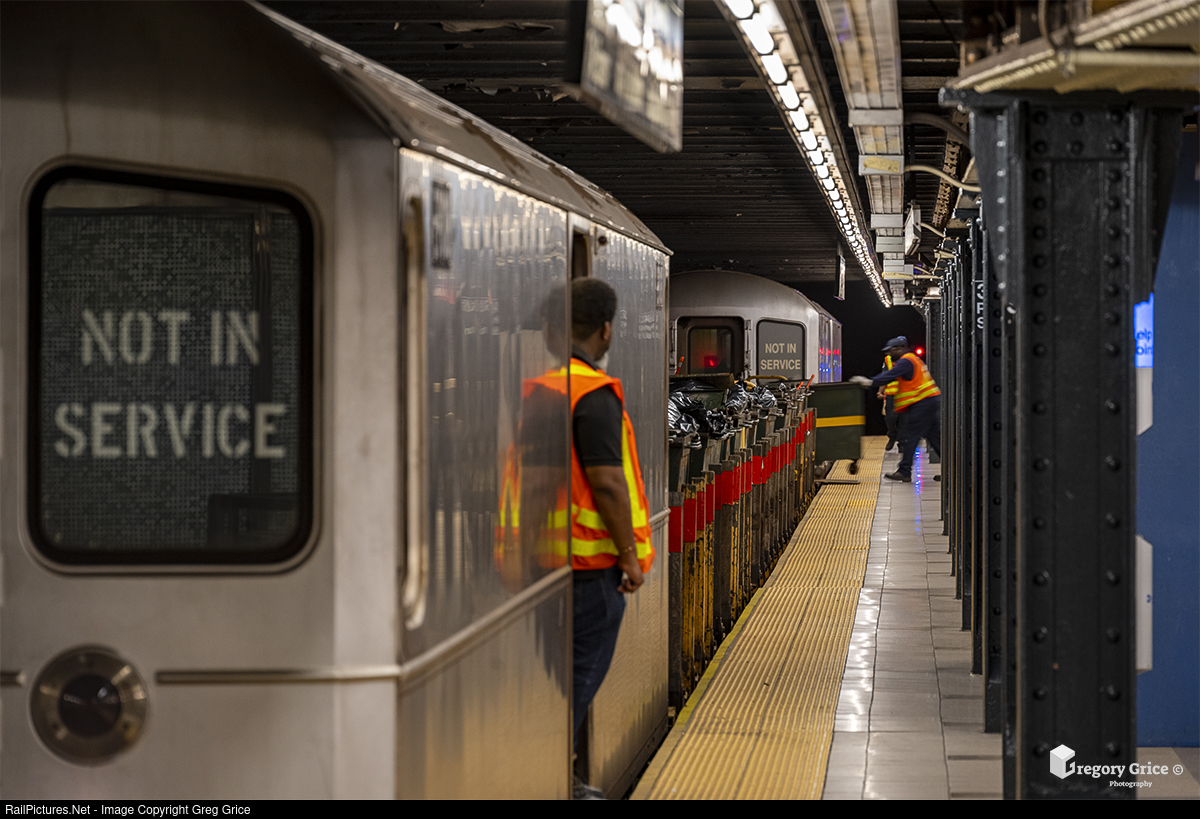 As most of the city rests, (contrary to belief), one of several nightly New York City Transit garbage train crews loads trash-filled carts onto special flatcars at 34th Street–Penn Station on the IRT Broadway–Seventh Avenue Line in Manhattan, New York.