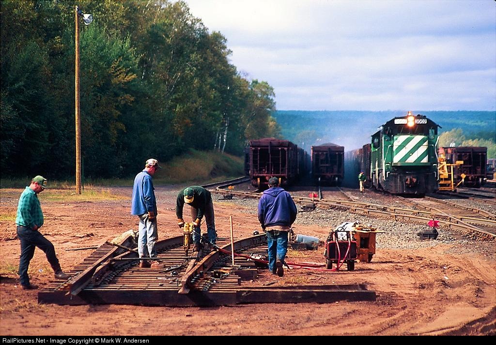 Track gang assembles a switch as the Hill Job arrives in West Yard with its ore train.