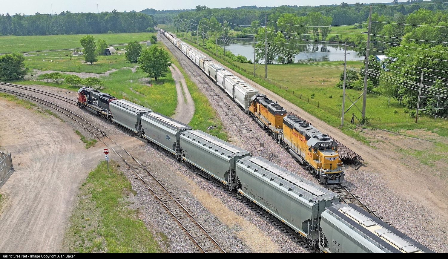 UP's Adams-Wisconsin Rapids way freight holds at Nekoosa Jct while the CN's afternoon switch job enters the north leg of the wye.