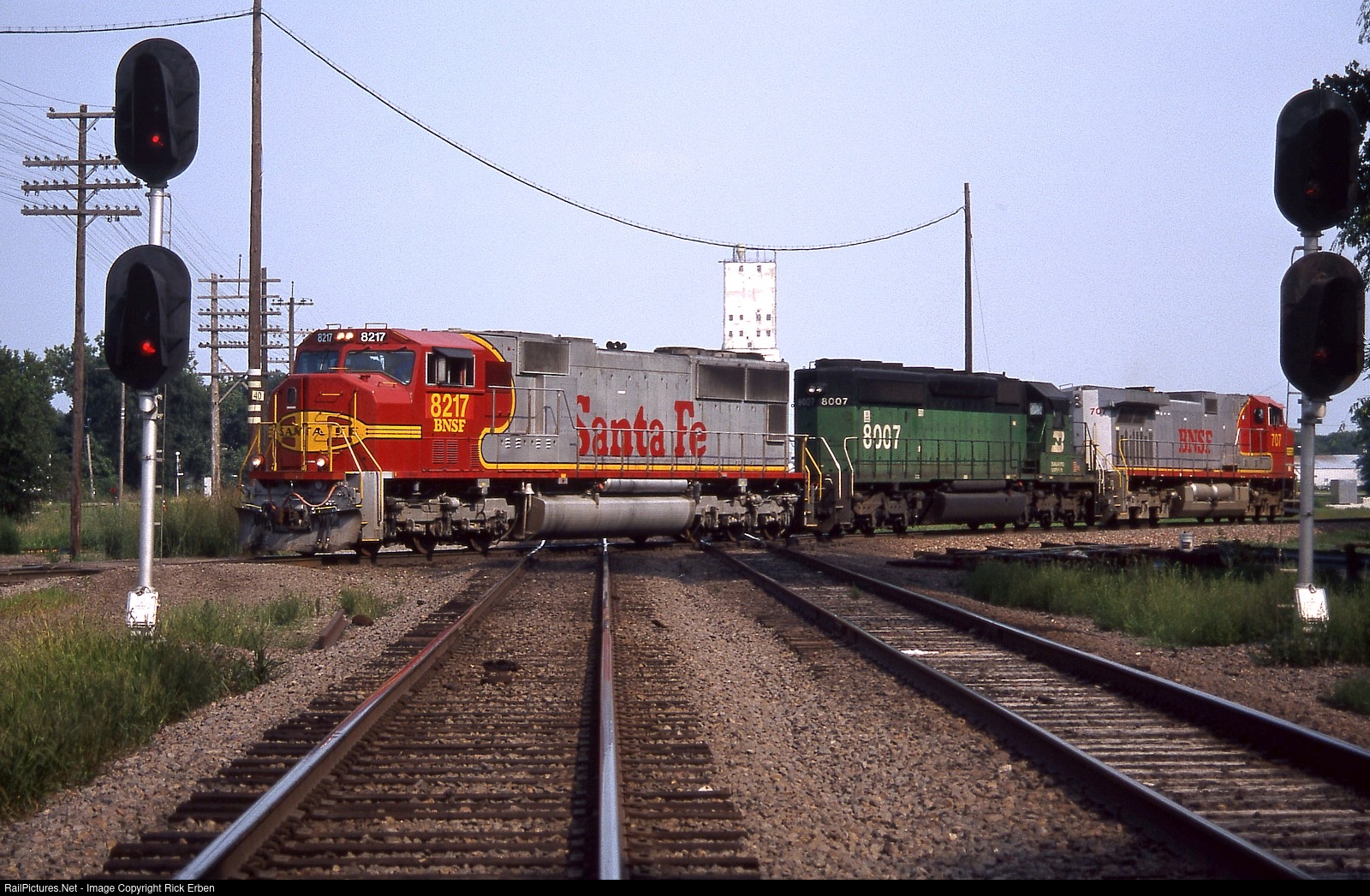 A lite power set crosses the UP in Fremont, NE. The BNSF merger had already defiled the warbonnet scheme, as the SD75Ms had their super fleet 200 series numbers bounced to the 8200s with a gaudy patch; and the Dash9 looked awful with that BNSF in lieu of Santa Fe. Thus only the SD40-2 splicing the warbonnets remains true to its heritage as part of BNs huge SD40-2 fleet.
