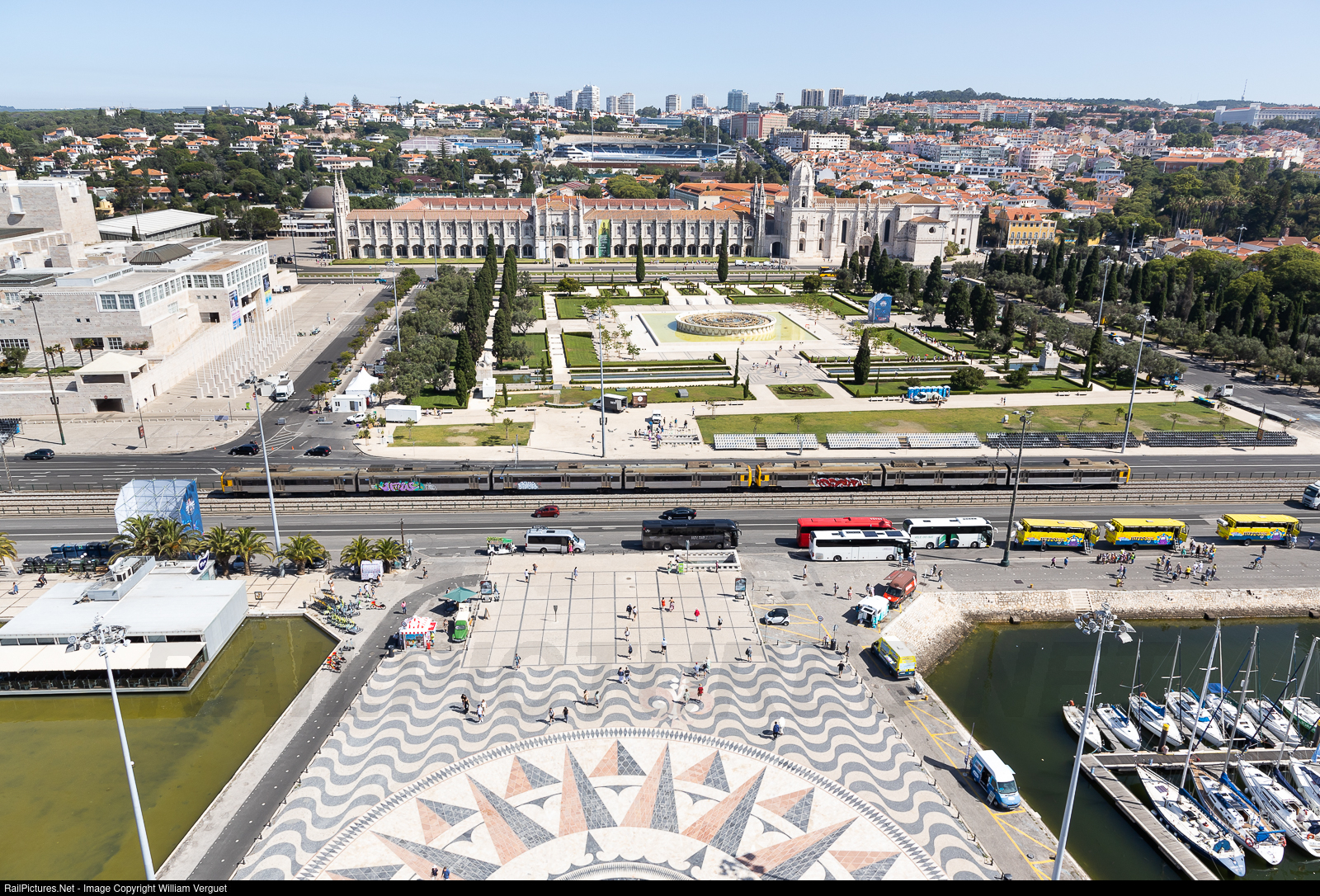 A train from Cascais to Lisbon passes at the foot of the Monument to the Discoveries, in front of the Jerónimos Monastery