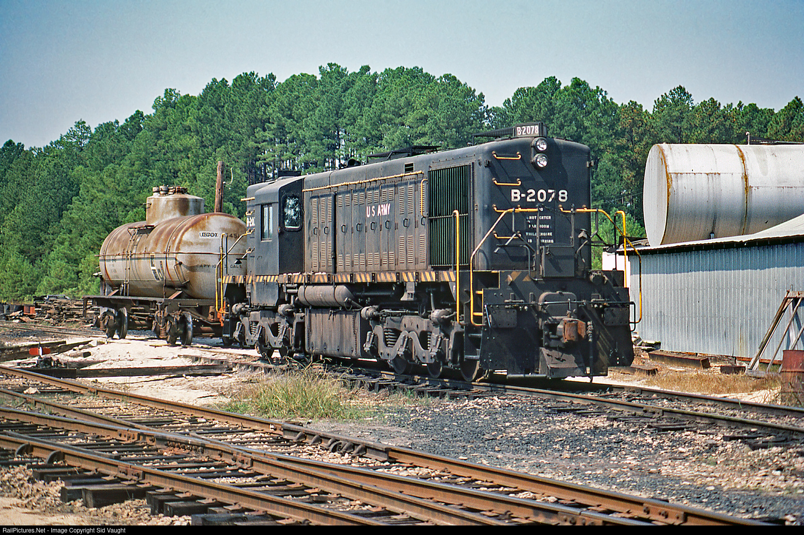 | This railroad serves Ft. Liberty (formerly Bragg) for the most part using Army locomotives. In 1985 their main traffic was fuel for Pope AFB, at the north end of the line. One of three active units on this date. Photo by Jim Satterwhite, from my collection. |