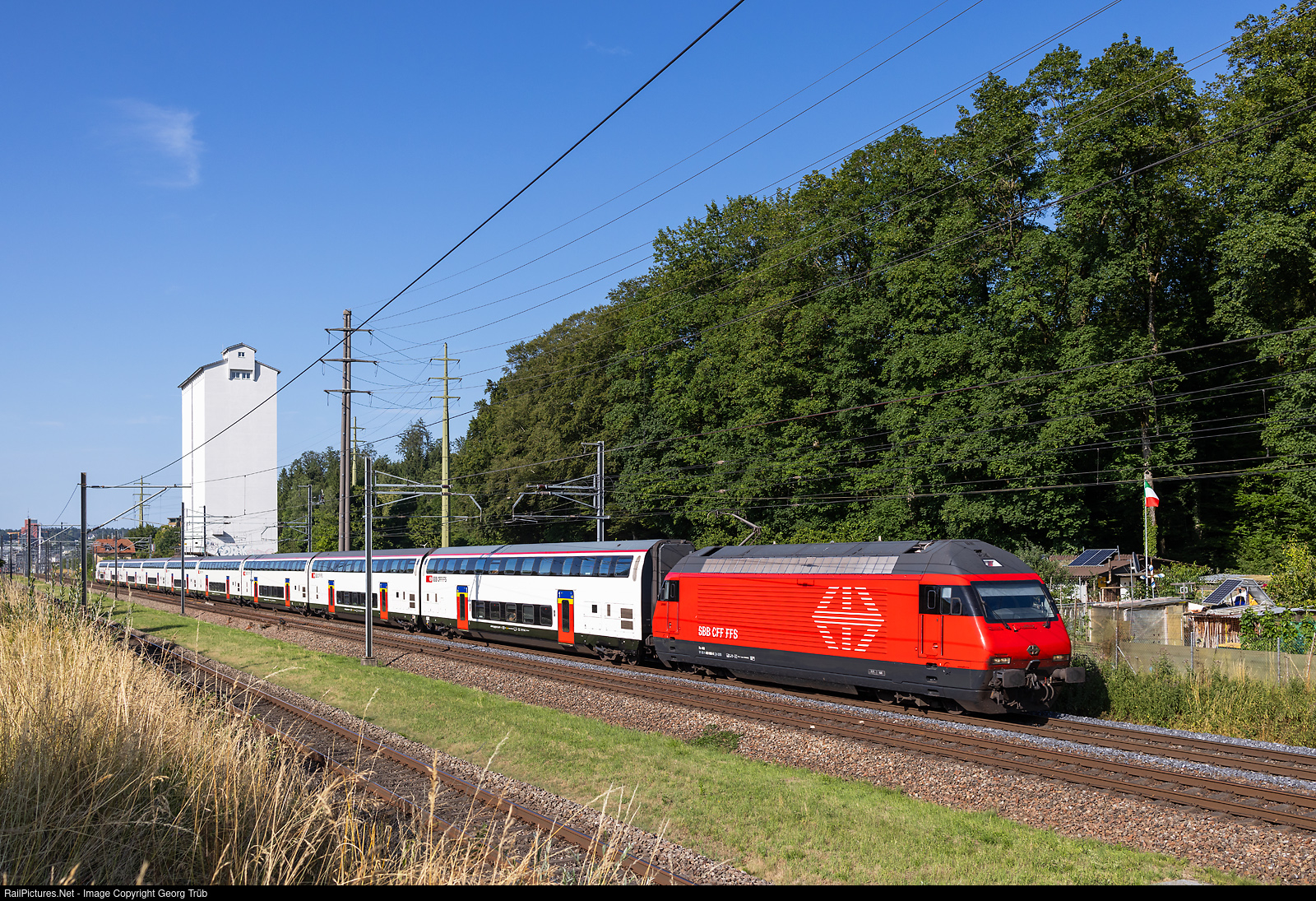 | Re 460 # 088 of the SBB is leaving Winterthur with the Interregio 2130 of the line IR 75 from Constance via Weinfelden-Winterthur-Zürich-Zug to Lucerne. This "IC2020" push-pull train has a first class A(2E) behind the locomotive instead of an AD(2E) with a smal baggage compartment. |