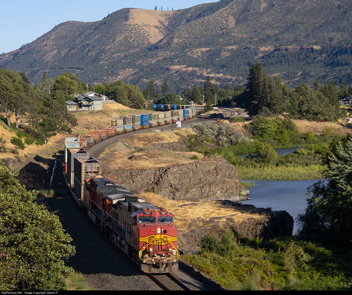 | An empty Interbay trash train curves through Lyle, over the mouth of the Klickitat river, with a BNSF bonnet leading the way. |