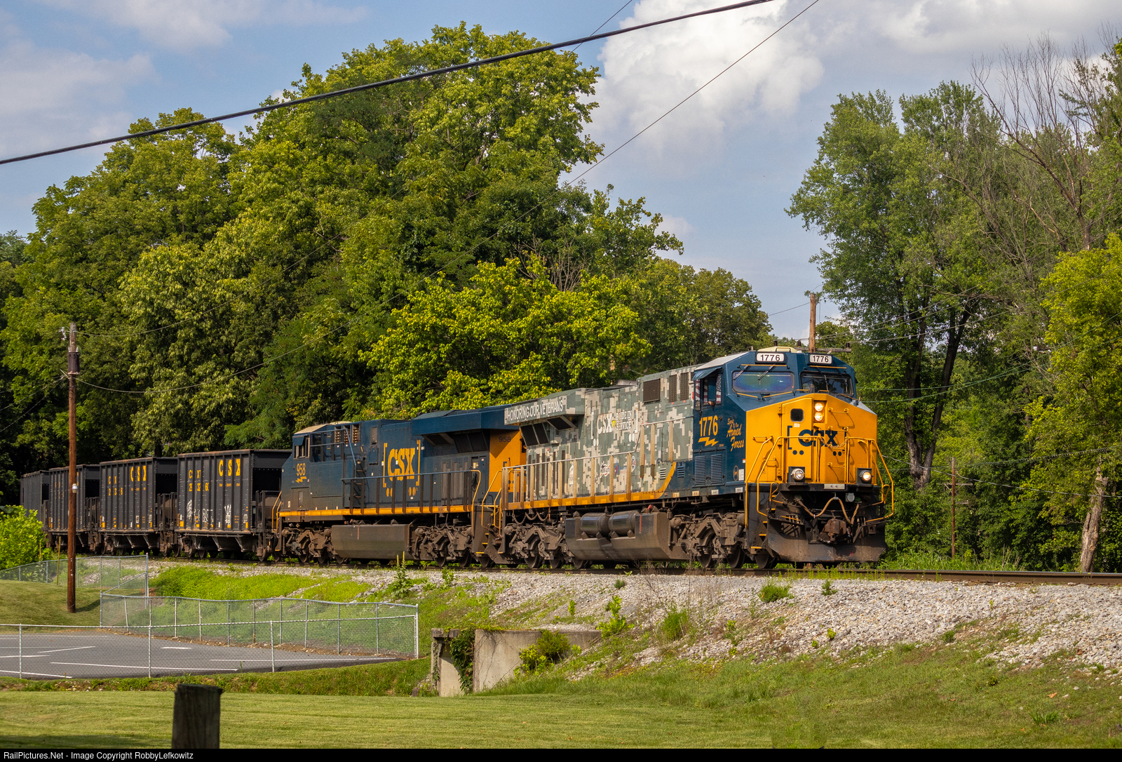 CSXT 1776, the Spirit of Armed Forces unit, leads empty rock train B455 on its westbound turn from Benning Yard in Washington, DC to the stone mine in Millville, WV. Seen here, the engine rounds the final bend before entering the yard limits to the mine.